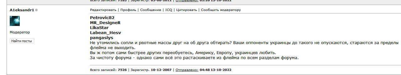 Модератор | Редактировать | Профиль | Сообщение | ICQ | Цитировать | Сообщить модератору Petrovic82 Цитата:| Пойду ботинки чистить и переобуваться | Либо так, либо КНДР. Хотя не знай, что там в ваших умах с момента того скрина 2022 года, может быть и КНДР стала идеалом, к которому надо стремится. Мне глобально безразлично на страны, национальности.. Везде есть нормальные люди с большой буквы и нелюди. Мне по жизни приятнее отслеживать научный прогресс, технологии, Нобелевку обсудить. Как вас хватает на каждодневное перемалывание всего этого, со скринами, гиперссылками, кучей цитат, держать всё это в подкорке, я хз, на сколько вы выжжены изнутри и что там в вас вообще осталось. Что там сейчас в тренде, в конец угробленная экономика, критический износ промышленного оборудования и коммуникаций, убыточные монополии типа РЖД, может быть сбитие спутников камнями при последнем угробленном космодроме.. вы сами за меня можете продолжать долго этот список. Только почему то я окажусь русофобом, а вы патриотом, а не наоборот Но это ваш выбор (наверное), и пока из вас в модерируемом мной разделе не начинает сыпаться это: Подробнее..., я вас не трогаю. Перегибаете - получаете запрет на пост. Никого по форумам по всем разделам не отслеживаю, кто что где пишет. И неинтересно, и времени нет. | Всего записей: 7563 | Зарегистр. 10-12-2007 | Отправлено: 18:13 28-12-2025 | Исправлено: A1eksandr1, 18:16 28-12-2025 |