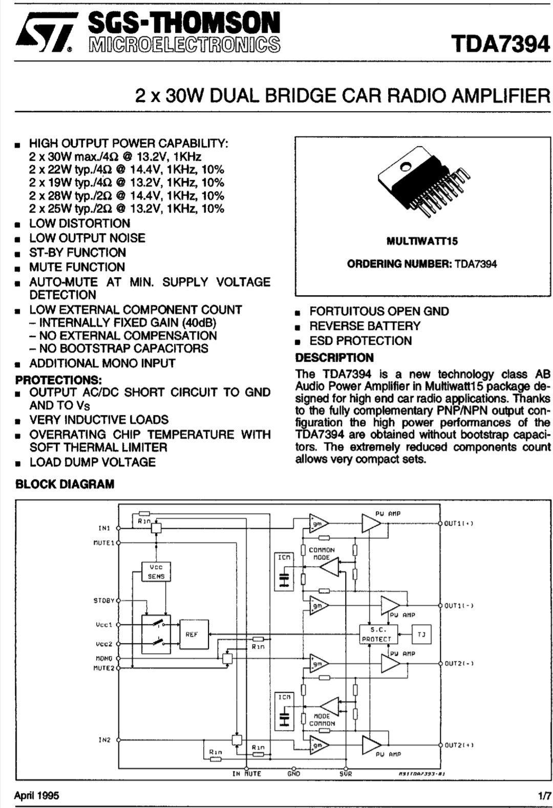 Tracker Mod | Редактировать | Профиль | Сообщение | Цитировать | Сообщить модератору WildGoblin Кстати, по поводу УМЗЧ (усилитель мощности ЗЧ) - наилучшими с точки зрения качества сигнала являются усилители класса А т.к. в них активный элемент никогда не уходит в отсечку (не выключается, спектральные искажения при синусоидальном сигнале <= 10%), поэтому они вносят минимальные искажения в усиливаемый сигнал, но зато рассеиваемая на их выходном каскаде мощность может быть сопоставима или больше чем отдаваемая им в нагрузку. Далее, по мере возрастания уровня спектральных искажений сигнала следуют классы B (угол отсечки 90° = 1/2 периода сигнала, спектральные искажения до 43%), C (90° < угол отсечки < 180°, спектральные искажения до 80%), D (угол отсечки 180°, ключевой, этот режим используют все цифровые УМЗЧ, спектральные искажения до 100%). И единственное преимущество класса D над другими это минимальная мощность рассеивая на выходном каскаде. А его применимость кстати довольно ограничена - минимальный уровень входного сигнала должен быть выше напряжения включения ключа, что снижает входной динамический диапазон таких усилителей до 10 - 15 dB, а у аналоговых нижний порог амплитуды входного сигнала ограничен уровнем их собственных тепловых шумов и динамический диапазон легко может достигать 90 - 100 dB. А с повышенным тепловыделением есть очень простой способ борьбы - использование промежуточного режима класса AB когда при малых сигналах выходной каскад работает в режиме класса А с минимальным искажениями, а при их возрастании переходит в режим класса B. Пример - микросхемы УМЗЧ серий TDA72xx/TDA73xx - TDA7393/TDA7394 TDA7293 (datasheet, PDF) они греются не столь сильно как усилители класса А и имеют невысокие спектральные искажения. Например 100 Вт микросхемы УМЗЧ TDA7293/7294 (схема усилительного канала в них одинакова) при мощности до 50 Вт обеспечивает уровень спектральных искажений менее 0,1%, 1% при 75 Вт и 10% при 100 Вт, а аналогичный по мощности "цифровой" усилитель имеет уровень спектральных искажений 30% - 50%, и то за счёт усложнения схемы - зато "правильные пацаны" считает его единственно возможным - он же ЦИФРОВОЙ!... Для питания усилителей импульсный БП даст только выигрыш в своих габаритах, и породит проблему фильтрации создаваемых им помех, и так же способен вызвать такие неприятности как синхронное самовозбуждение схемы УМЗЧ на частоте работы схемы БП. Это явление на этапе расчёта довольно сложно просчитать, но оно вероятно. А габариты и сложность выходного фильтра импульсного БП могут свести в минус эффект от уменьшения его размеров. Для БП на 50/60 ГЦ если на его выходе стоят только конденсаторы габариты будут приличные, но можно поставить на его выходе LC фильтры их можно сократить, а заодно повысить степень фильтрации сетевых помех что улучшит качество выходного сигнала. НО! "Это же не цифра по оптике", а значит с точки зрения "правильных пацанов" по определению хуже ибо физика для них пустой звук они же ВЕРУЮ В СВЯТУЮ ЦИФРУ! и быть по сему!.