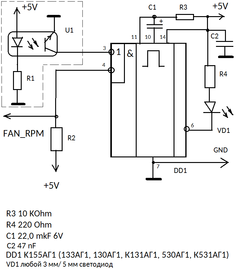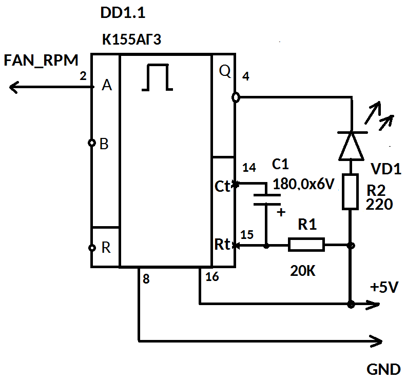 Tracker Mod | Редактировать | Профиль | Сообщение | Цитировать | Сообщить модератору U235 В схеме управления вентилятора могут использоваться любые датчики по выбору их разработчика, в стандарте тип датчика не оговорен, но он обязан иметь выход с открытым коллектором или стоком с допустимым током нагрузки и максимальным напряжением на закрытом ключе 5 мА / 12V для 12V и 12V мА / 24V для 24V вентиляторов соответственно. Поэтому в схеме должен стоять подтягивающий резистор на шину питания с которого и будет сниматься сигнал, либо выход может быть нагружен на светодиод развязки с балластным резистором. Элементарно. И отсюда, если нет задачи контролировать число оборотов следует и четвёртый самый простой вариант - к выходу датчика припаиваем катод 3 мм светодиода любого желаемого цвета, анод через резистор R с мощностью рассеивания не менее 62 мВт подключаем на линию 5V, а R зависит от цвета диода: для зелёных, красных - 800 Ом, для жёлтых и оранжевых - 720 Ом, для белых и голубых - 600 Ом. И всё, пока вентилятор вращается визуально светодиод горит, остановился - погас, но хотя само свечение будет не ярким, видно будет. Хотим сделать ярко? - не проблема, цепляем диод к Т-триггеру (счётному). На 5V резистор 1,8 КОм, с выхода датчика сигнал на вход синхронизации микросхемы 130/131/133/155/530/531ТВ1 (это JK триггер с логикой 3И на входах, TTL логика, 5V, потребляет до 30 мА от цепи 5V, между ногами 14 и 7 корпуса надо поставить ВЧ керамику ёмкостью 47 nF), вход датчика на её вход С, а на инверсный выход через балластный резистор 160 Ом голубой или белый светодиод и он будет светится ярко. Другие диоды не подойдут из-за меньших напряжений открывания. Не задействованные ноги триггера можно оставить свободными - частоты не велики. Микросхемы серий 130, 133, 530 выполнены в планарных корпусах с шагом выводов 1,25 мм, а 131, 155, 531 в DIP-14 с шагом выводов 2,5 мм. В данном случае для индикатора нужен один корпус, и удобнее в DIP - плата не нужна ибо резистор и ёмкость паяем на его выводах и клеим на корпус машины - пущай не греется!