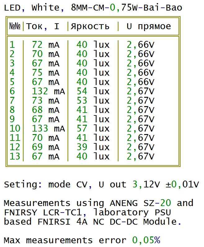 Сделал тут тест белых 8 мм 0,75W светодиодов DSSRQI F8. Пришлось повозится - каждое измерение по 10 раз и обсчёт статистики. Зато понятно что от них ждать: