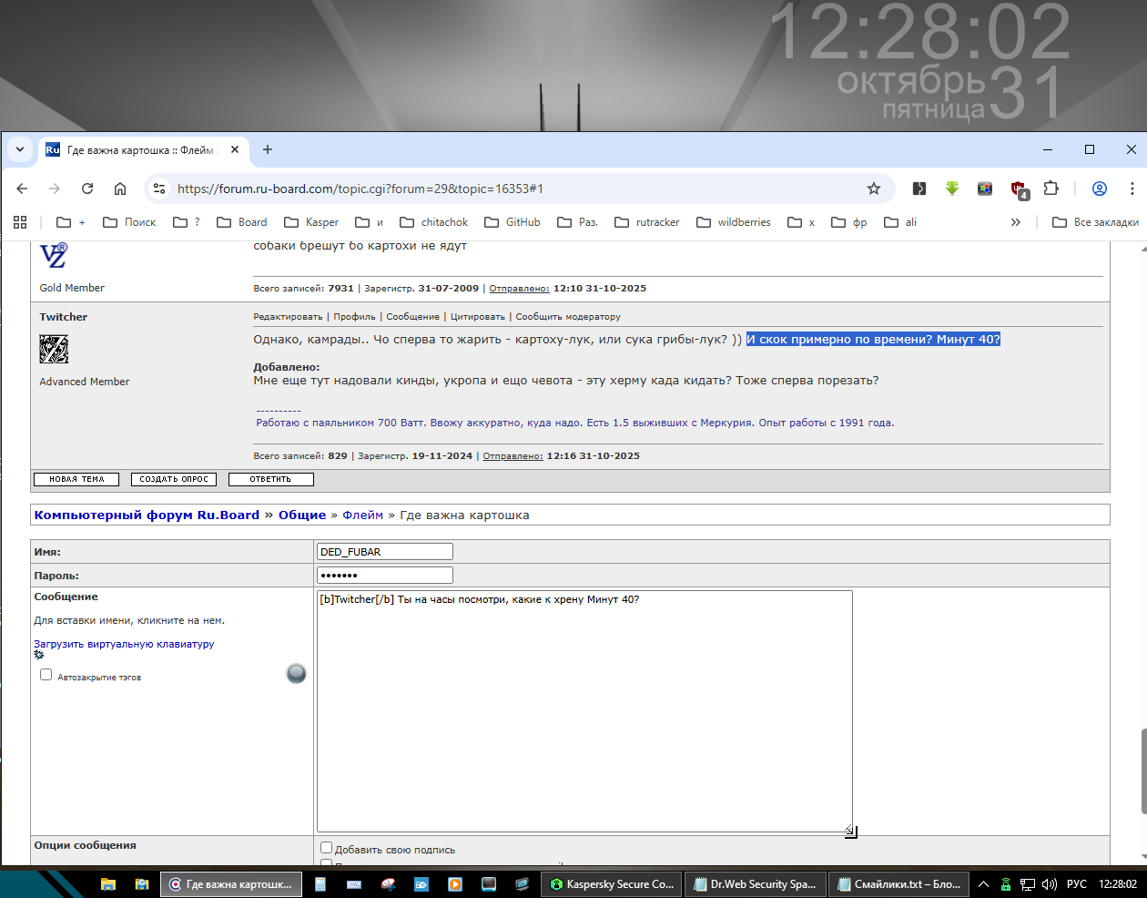 BANNED | Редактировать | Профиль | Сообщение | Цитировать | Сообщить модератору Кароче.. 2 раза ошпарился.. По итогам теста.. Первое кидаем - лук, грибы и по интересам.. Там кукурузу, портянки, женские прокладки... Заливаем оливковым маслом, греем минут 15.. Потом вспоминаем, что мы хотели таки картошку.. Кидаемся резать.. ( я опытный, я заранее нарезал ).. Нарезанные ломтики картофана кидаем в этот маслянный ад... Накрываем крышкой, полотенцем, своей жопой.. что удобнее.. Ждём таки не 40, а 39 минут - и блюдо готово!! Открываем спиртное - и начинаем ужин )) Добавлено: Всем приятного аппетита, голодные камрады.. )) Хехе.. |