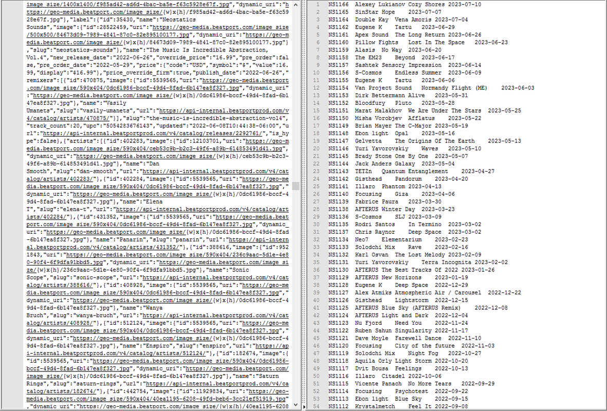 Full Member | Редактировать | Профиль | Сообщение | Цитировать | Сообщить модератору А как пропарсить эту кашу? Тут же не от чего отталкиваться. Это beatport вчера обновил свой дизайн, теперь он не парсится Octoparse, а ParseHub вообще показывает черный экран вместо страниц. Если сохранить страницу целиком, там привычная структура с DIV а если скопировать исходный код кстраницы то эта каша, но нужна именно эта каша, так как в ней почемуто есть номера каталогов, посмотреть которые можно только заходя на страницы релизов. Здесь зачемто даже описания релизов, которые также только на страницах релизов. Нужны имена артистов, названия релизов и номера каталогов, а вот ссылок тут нет, тут ссылка на api + id страницы (это цифры в конце страницы), но он бесмысленен, так как в адресе страниц релизов еще слова из названия релизов, ссылки ест ьтокль в сохраненной странице с div, в принципе они не нужны, хотя часто нужны. https://regex101.com/r/oqV5rB/1 Например, нужны: 1. "name":"Alexey Lukianov" "name":"Cozy Shores" "catalog_number":"NS1166" "new_release_date":"2023-07-10" 2. "name":"SinStar" "name":"Hope" "new_release_date":"2023-07-07" "catalog_number":"NS1165" На сайте regex какойто мусор, но в notepad все нормально. Единственное, вместо артиста иногда сборник и написано Various Astists, тогда берется любой артист из сборника, закономеррности не заметил, зачем список артистов на странице списка релихов - тоже не понятно, как и номер каталога и описание. Думаю, разрабы сами не поняли, что сделали. Не хватает ссылок на релизы, а получитьих можно только пропарсив сохраненную страницу html Результат: https://i.postimg.cc/qRGfS7sL/2023-07-12-163143.png | Всего записей: 467 | Зарегистр. 02-04-2011 | Отправлено: 13:54 12-07-2023 | Исправлено: Celsus, 09:00 13-07-2023 |