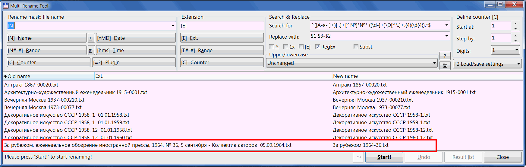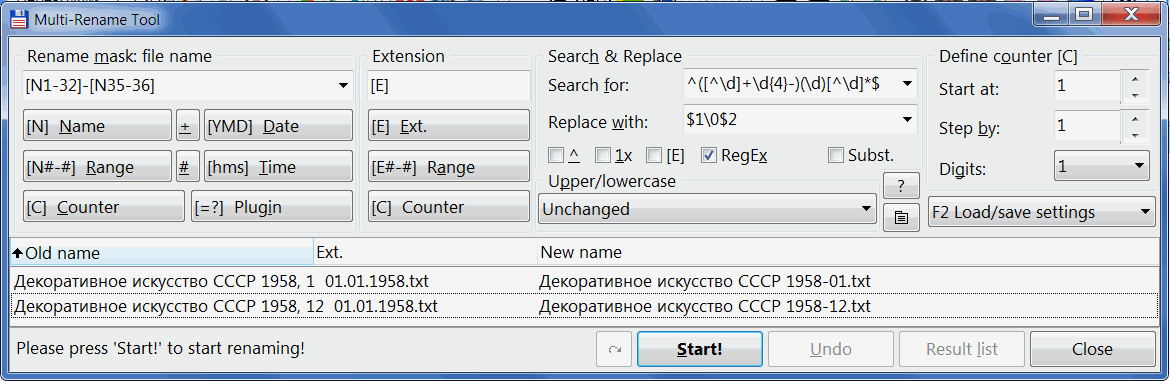 Цитата: Декоративное искусство СССР 1958, 1 01.01.1958 Декоративное искусство СССР 1958, 2 01.01.1958 Декоративное искусство СССР 1958, 3 01.01.1958 Декоративное искусство СССР 1958, 4 01.01.1958 Декоративное искусство СССР 1958, 5 01.01.1958 Декоративное искусство СССР 1958, 6 01.01.1958 Декоративное искусство СССР 1958, 7 01.01.1958 Декоративное искусство СССР 1958, 8 01.01.1958 Декоративное искусство СССР 1958, 9 01.01.1958 Декоративное искусство СССР 1958, 10 01.01.1958 Декоративное искусство СССР 1958, 11 01.01.1958 Декоративное искусство СССР 1958, 12 01.01.1958 Как вы сказали, вставляю "Найти" ^(.+), (\d).*$ "Заменить на" $1-0$2 Программа выставляет файлы в такой последовательности Декоративное искусство СССР 1958, 1 01.01.1958 Декоративное искусство СССР 1958, 10 01.01.1958 Декоративное искусство СССР 1958, 11 01.01.1958 Декоративное искусство СССР 1958, 12 01.01.1958 Декоративное искусство СССР 1958, 2 01.01.1958 Декоративное искусство СССР 1958, 3 01.01.1958 Декоративное искусство СССР 1958, 4 01.01.1958 Декоративное искусство СССР 1958, 5 01.01.1958 Декоративное искусство СССР 1958, 6 01.01.1958 Декоративное искусство СССР 1958, 7 01.01.1958 Декоративное искусство СССР 1958, 8 01.01.1958 Декоративное искусство СССР 1958, 9 01.01.1958 меняет на Декоративное искусство СССР 1958-1 Декоративное искусство СССР 1958-1 Декоративное искусство СССР 1958-1 Декоративное искусство СССР 1958-1 Декоративное искусство СССР 1958-2 Декоративное искусство СССР 1958-3 Декоративное искусство СССР 1958-4 Декоративное искусство СССР 1958-5 Декоративное искусство СССР 1958-6 Декоративное искусство СССР 1958-7 Декоративное искусство СССР 1958-8 Декоративное искусство СССР 1958-9 10,11,12 ассоциируются как просто 1 |