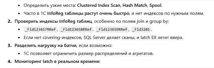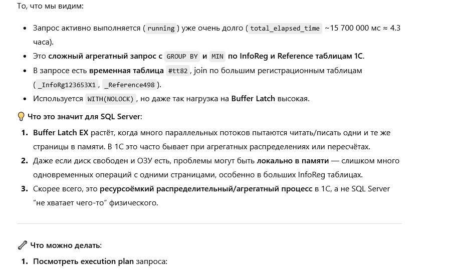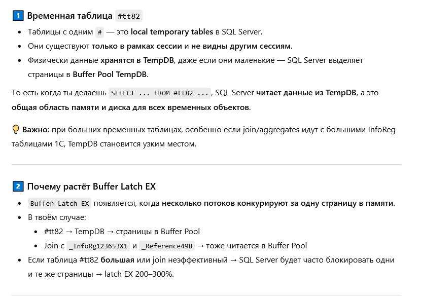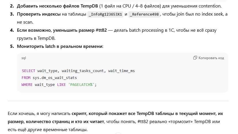 Advanced Member | Редактировать | Профиль | Сообщение | ICQ | Цитировать | Сообщить модератору contrafack Код: 77 running 0 NULL 0 15699911 15700205 (@P1 numeric(10),@P2 numeric(10),@P3 numeric(10))SELECT T1._Q_000_F_002RRef, T1._Q_000_F_003RRef, T1._Q_000_F_004RRef, ISNULL(T3._Fld13651RRef,0x00000000000000000000000000000000), CASE WHEN (ISNULL(T3._Fld13651RRef,0x00000000000000000000000000000000) = 0x8F411131DFD4B8184305C1582EFEFC30) THEN 0x01 ELSE 0x00 END, ISNULL(T3._Fld13650_TYPE,0x01), ISNULL(T3._Fld13650_RTRef,0x00000000), ISNULL(T3._Fld13650_RRRef,0x00000000000000000000000000000000), 0x00000000000000000000000000000000, 0x00000000000000000000000000000000, 0x00000000000000000000000000000000, T2._Fld123660_TYPE, T2._Fld123660_RTRef, T2._Fld123660_RRRef, MIN(T2._Fld123654), MIN(T2._Fld123654), MIN(T2._Fld123664), @P1, 0x00 FROM #tt82 T1 WITH(NOLOCK) INNER JOIN dbo._InfoRg123653X1 T2 ON (T1._Q_000_F_002RRef = T2._Fld123657RRef) AND (T1._Q_000_F_003RRef = T2._Fld123658RRef) AND (T1._Q_000_F_004RRef = T2._Fld123659RRef) LEFT OUTER JOIN dbo._Reference498 T3 ON ((T1._Q_000_F_003RRef = T3._IDRRef)) AND (T3._Fld3201 = @P2) WHERE (T2._Fld3201 = @P3) GROUP BY T1._Q_000_F_002RRef, T1._Q_000_F_003RRef, T1._Q_000_F_004RRef, ISNULL(T3._Fld13651RRef,0x00000000000000000000000000000000), CASE WHEN (ISNULL(T3._Fld13651RRef,0x00000000000000000000000000000000) = 0x8F411131DFD4B8184305C1582EFEFC30) THEN 0x01 ELSE 0x00 END, ISNULL(T3._Fld13650_TYPE,0x01), ISNULL(T3._Fld13650_RTRef,0x00000000), ISNULL(T3._Fld13650_RRRef,0x00000000000000000000000000000000), T2._Fld123660_TYPE, T2._Fld123660_RTRef, T2._Fld123660_RRRef | вижу что выборка из какой-то таблицы #tt это типа временная таблица где-то, и из нее что-то выбирается постоянно. Где она лежит? В памяти?, в базе такой таблы нет. Или в кэшэ. уже перевалило за 306%! Это как? из плана выполнения запроса Код:| SELECT T1._Q_000_F_002RRef, T1._Q_000_F_003RRef, T1._Q_000_F_004RRef, ISNULL(T3._Fld13651RRef,0x00000000000000000000000000000000), CASE WHEN (ISNULL(T3._Fld13651RRef,0x00000000000000000000000000000000) = 0x8F411131DFD4B8184305C1582EFEFC30) THEN 0x01 ELSE 0x00 END, ISNULL(T3._Fld13650_TYPE,0x01), ISNULL(T3._Fld13650_RTRef,0x00000000), ISNULL(T3._Fld13650_RRRef,0x00000000000000000000000000000000), 0x00000000000000000000000000000000, 0x00000000000000000000000000000000, 0x00000000000000000000000000000000, T2._Fld123660_TYPE, T2._Fld123660_RTRef, T2._Fld123660_RRRef, MIN(T2._Fld123654), MIN(T2._Fld123654), MIN(T2._Fld123664), @P1, 0x00 FROM #tt82 T1 WITH(NOLOCK) INNER JOIN dbo._InfoRg123653X1 T2 ON (T1._Q_000_F_002RRef = T2._Fld123657RRef) AND (T1._Q_000_F_003RRef = T2._Fld123658RRef) AND (T1._Q_000_F_004RRef = T2._Fld123659RRef) LEFT OUTER JOIN dbo._Reference498 T3 ON ((T1._Q_000_F_003RRef = T3._IDRRef)) AND (T3._Fld3201 = @P2) WHERE (T2._Fld3201 = @P3) GROUP BY T1._Q_000_F_002RRef, T1._Q_000_F_003RRef, T1._Q_000_F_004RRef, ISNULL(T3._Fld13651RRef,0x00000000000000000000000000000000), CASE WHEN (ISNULL(T3._Fld13651RRef,0x00000000000000000000000000000000) = 0x8F411131DFD4B8184305C1582EFEFC30) THEN 0x01 ELSE 0x00 END, ISNULL(T3._Fld13650_TYPE,0x01), ISNULL(T3._Fld13650_RTRef,0x00000000), ISNULL(T3._Fld13650_RRRef,0x00000000000000000000000000000000), T2._Fld123660_TYPE, T2._Fld123660_RTRef, T2._Fld123660_RRRef | в удобочитаемом виде Код: SELECT T1._Q_000_F_002RRef, T1._Q_000_F_003RRef, T1._Q_000_F_004RRef, ISNULL(T3._Fld13651RRef,0x00000000000000000000000000000000), CASE WHEN (ISNULL(T3._Fld13651RRef,0x00000000000000000000000000000000) = 0x8F411131DFD4B8184305C1582EFEFC30) THEN 0x01 ELSE 0x00 END, ISNULL(T3._Fld13650_TYPE,0x01), ISNULL(T3._Fld13650_RTRef,0x00000000), ISNULL(T3._Fld13650_RRRef,0x00000000000000000000000000000000), 0x00000000000000000000000000000000, 0x00000000000000000000000000000000, 0x00000000000000000000000000000000, T2._Fld123660_TYPE, T2._Fld123660_RTRef, T2._Fld123660_RRRef, MIN(T2._Fld123654), MIN(T2._Fld123654), MIN(T2._Fld123664), @P1, 0x00 FROM #tt82 T1 WITH(NOLOCK) INNER JOIN dbo._InfoRg123653X1 T2 ON (T1._Q_000_F_002RRef = T2._Fld123657RRef) AND (T1._Q_000_F_003RRef = T2._Fld123658RRef) AND (T1._Q_000_F_004RRef = T2._Fld123659RRef) LEFT OUTER JOIN dbo._Reference498 T3 ON ((T1._Q_000_F_003RRef = T3._IDRRef)) AND (T3._Fld3201 = @P2) WHERE (T2._Fld3201 = @P3) GROUP BY T1._Q_000_F_002RRef, T1._Q_000_F_003RRef, T1._Q_000_F_004RRef, ISNULL(T3._Fld13651RRef,0x00000000000000000000000000000000), CASE WHEN (ISNULL(T3._Fld13651RRef,0x00000000000000000000000000000000) = 0x8F411131DFD4B8184305C1582EFEFC30) THEN 0x01 ELSE 0x00 END, ISNULL(T3._Fld13650_TYPE,0x01), ISNULL(T3._Fld13650_RTRef,0x00000000), ISNULL(T3._Fld13650_RRRef,0x00000000000000000000000000000000), T2._Fld123660_TYPE, T2._Fld123660_RTRef, T2._Fld123660_RRRef |