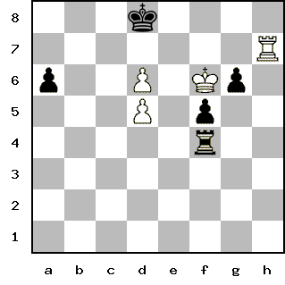 Advanced Member | Редактировать | Профиль | Сообщение | Цитировать | Сообщить модератору 26. ... Rd8xd6 Kasparaff Цитата:| игра сведётся уже предложеному мной варианту. | Не совсем - в предложенном Вами ранее варианте Цитата:| 22...Nb6,то 23.Bxd6 Nxd5 24.Rxd3 cd 25.c4 | сделанного в партии хода у черных не было. Впрочем, возможно, что итог действительно не меняется... Вариант: 27. Pe5xd6 Re8-e3+ 28. Kf3-f2 Re3-e2+ [chess_fb]W:Kf2,Nd2,Pa4,c4,d6,f4,g3,h3,Ra1/B:Kg8,Nd5,Pa6,b7,d3,f5,g6,h7,Re2[/chess_fb] Добавлено: Ошибся с тегом.  |