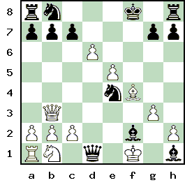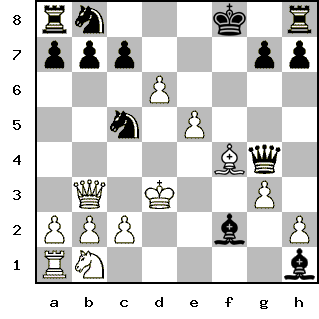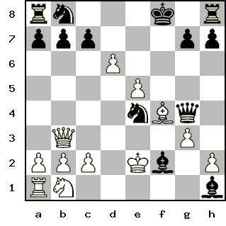 Шаман из Ижевска | Редактировать | Профиль | Сообщение | ICQ | Цитировать | Сообщить модератору Выхода нет. Сдаюсь) Cossack Спасибо за игру) Добавлено: [Event "Партия № 22"] [Site "Forum.Ru.Board"] [Date "26.09.2006"] [Round "-"] [White "COH"] [Black "Cossack"] [Result "0-1"] 1. Nf3 d5 2. Ng5 e5 3. Nxf7 Kxe7 4. e4 Qh4 5. Qf3 Nf6 6. ed Bg4 7. Qb3 Bc5 8. g3 Ne4 9. d6+ Kf8 10. Bg2 Bxf2+ 11. Kf1 Qf6 12. Bf3 Bxf3 13. d4 Bxh1 14. de Qf5 15. Bf4 Qh3+ 16. Ke2 Qg4+ 17. Kd3 Nc5+ 18. 0-1 вродь правильно