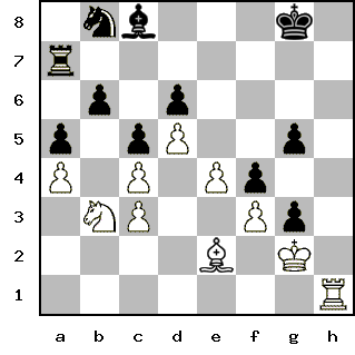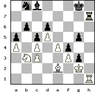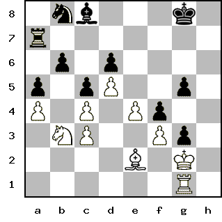 Silver Member | Редактировать | Профиль | Сообщение | Цитировать | Сообщить модератору PapaKarlo Цитата:| Да, поторопился я с 26-м ходом, упускаю инициативу | Ну, мне кажется, это вполне себе ход... Более активно можно было сыграть где-то раньше, чуть ли не с победоносным результатом, но это надо железо гонять опять. Цитата:| Нет, у меня точно что-то не в порядке с арифметикой - опять после 27-го хода белых следует 28-й ход черных! | Ну что вы, это всего лишь фирменный стиль - путать нумерацию ходов! Цитата: Предлагается вариант 28. Rg2xg3 f4xg3 | Вариант принимается, естественно. 29. Bc1-e3 А вот ради этого хода на данный микровариинт я в основном и пошел... Но это субъективно всё.