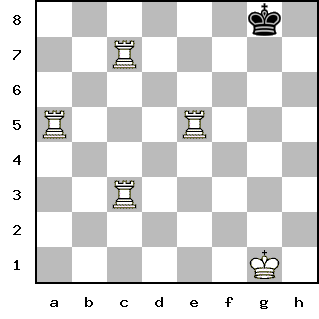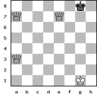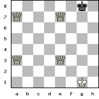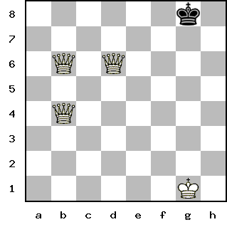 Advanced Member | Редактировать | Профиль | Сообщение | Цитировать | Сообщить модератору Известен способ сокращенной нотации шахматной партии, когда лишняя информация из записи убирается (такая себе компрессия ), например: 1. e4 e5 2. Nf3 Nc6 и т.д. Если возникают неоднозначности, правила предусматривают уточнение, на какой вертикали или горизонтали находилась фигура или пешка, которой делается ход. Например, продолжим партию: 3. Nc3 Nge7 В последнем случае на поле e7 могли пойти оба коня, поэтому запись 3. ... Nge7 уточняет, что ход был сделан именно конем, стоявшим на вертикали "g". А теперь - собственно вопрос: В какой ситуации, которая может возникнуть в партии без нарушения правил, невозможно записать ход, используя сокращенную нотацию? Приведите позицию. Приложение. Официальное описание правил записи можно легко найти через поисковик. Мне попалась, например, эта ссылка | Всего записей: 1050 | Зарегистр. 19-05-2004 | Отправлено: 23:21 10-01-2008 | Исправлено: PapaKarlo, 23:24 10-01-2008 |