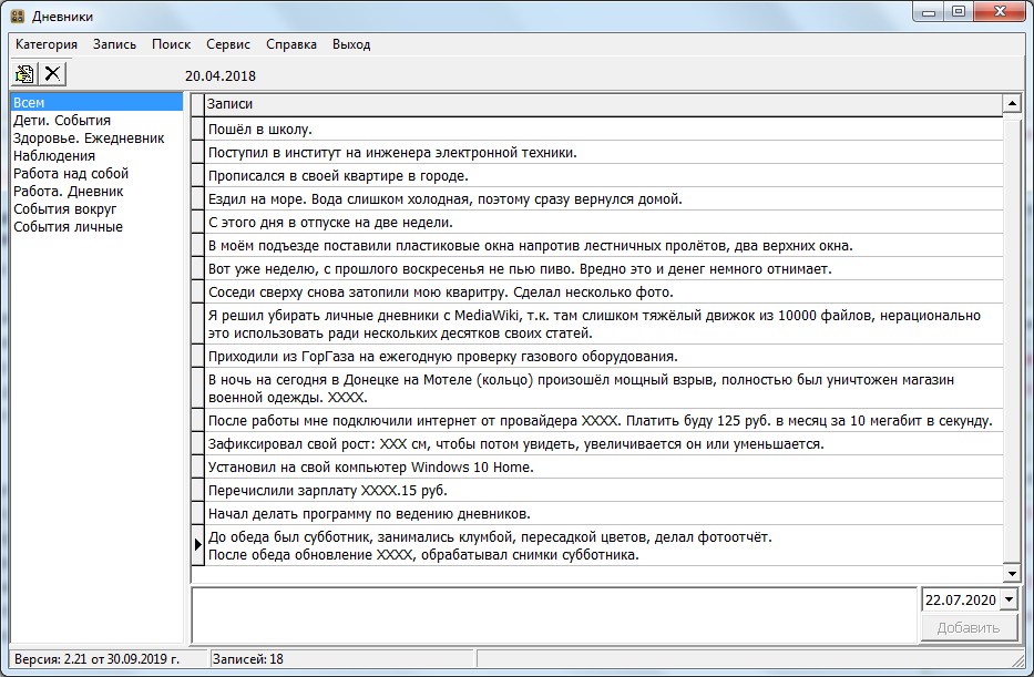Цитата: а в чем проблема указывать в качестве заголовка дату? в keynote кажется есть даже опция для автоматической простановки даты | Там бывает за один день много записей по одной строчке из двух слов. Например: обновил Коллаж, заправил картридж, сделал копию базы, отпросился раньше с работы, печатал 1ДФ, менял лампы, получил пачку бумаги и т.д. Давать таким коротким записям заголовки долго и бессмысленно и заголовки этих записей не нужны в в дереве "категорий". Для таких записей идеально подходит CintaNotes, ещё лучше Telegram, вот что-такое же найти бы. Для себя сделал программу Dnevnodel 2.21, выглядит так: Похожа на Telegram и CintaNotes, бесплатная, есть категории, быстрый ввод, поиск, пароль, дата записи, импорт, экспорт. Отличия от CintaNotes: у записей нет заголовков, категории вместо тегов. Но у этой программы внешний вид немного дубовенький, ну и хотелось бы что-то лучше, чем своя самоделка. | Всего записей: 179 | Зарегистр. 28-06-2008 | Отправлено: 09:10 27-07-2020 | Исправлено: frato, 14:22 27-07-2020 |