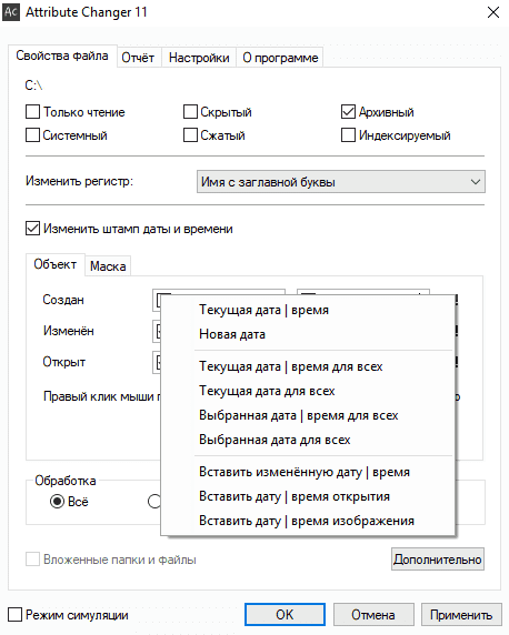 Attribute Changer - бесплатное дополнение для Windows, доступное через контекстное меню проводника.