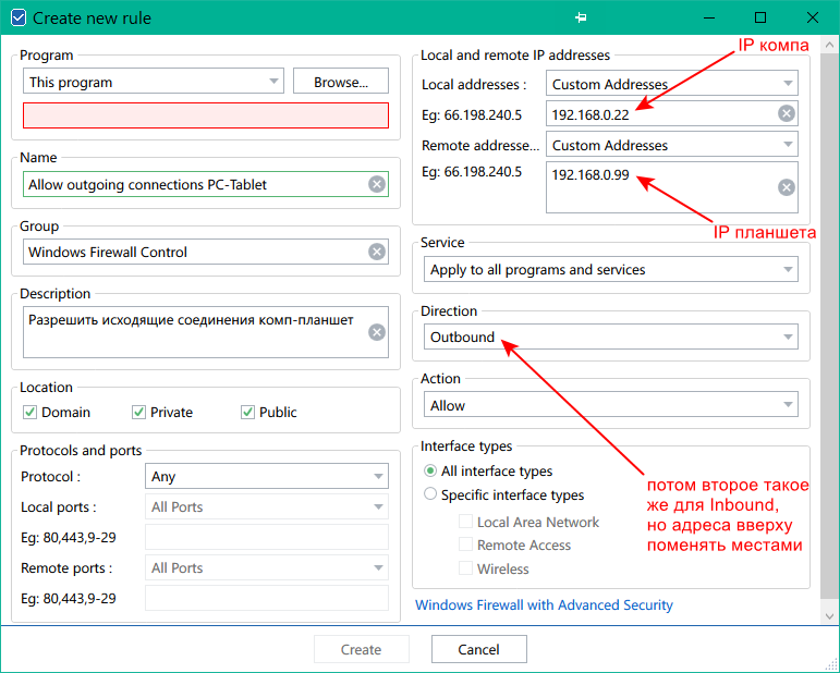 В примере удаленный адрес 101.... к делу отношения не имеет. В данном случае 192.168.0.22 это адрес твоего компа в локальной сети, адрес планшета будет 192.168.Х.ХХ, т.е. последние 1-2 группы цифр будут другими. Определи адрес планшета в локальной сети и создай два разрешающих правила (на исходящие и на входящие) соединений между этими адресами.