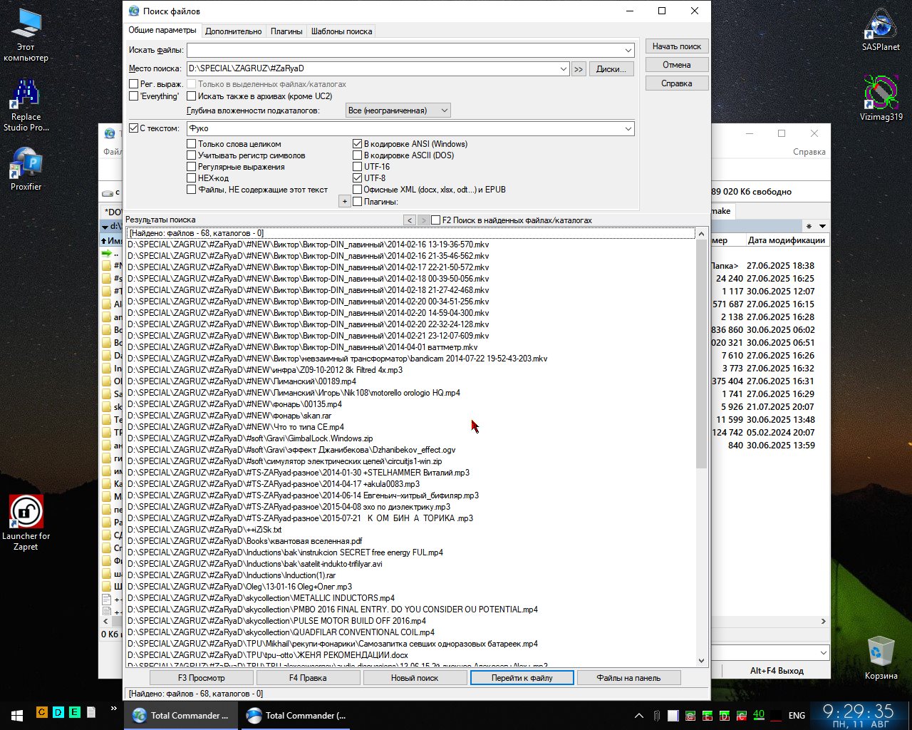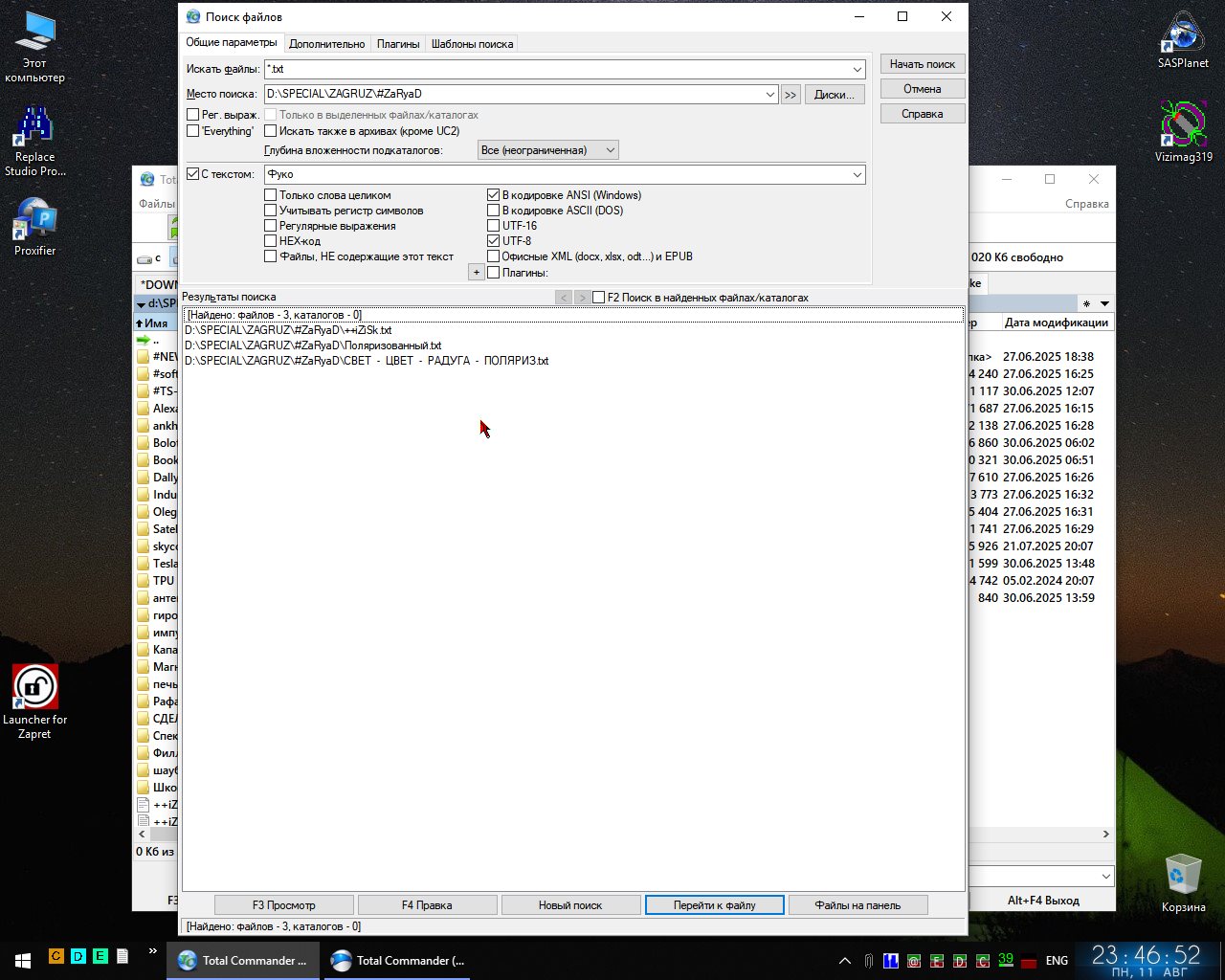 Gold Member | Редактировать | Профиль | Сообщение | Цитировать | Сообщить модератору FiLinX Я не очень понимаю, что именно там поломается. Каждый поиск является самостоятельной операцией, и критерии поиска настраиваются индивидуально в каждом случае. Нужно искать медиафайлы — задаёшь поиск медиафайлов. Нужно искать текстовики — ищешь текстовики. Надо текстовики с конкретным содержимым — добавляешь поиск по содержимому. Скажем, если в примере из скриншота в поле "Искать файлы" написать *.txt, то Тотал первым делом ограничит поиск исключительно текстовыми файлами, а потом начнёт их перебирать и проверять, а есть ли в конкретном текстовом файле искомая строка. Все остальные типы файлов будут пропущены. Если нет уверенности, что строка присутствует только в файлах с расширением TXT, и хочется найти вообще все файлы с таким содержимым, и исключить всякие медиа-файлы, то тут уже пригодится маска-исключение. Например, если задать "*.* | *.mkv *.mp4 *.mp3 *.ogv" (без кавычек), то Тотал возьмёт все файлы, какие есть, исключит из этого списка те, что соответствуют любому из расширений после вертикальной черты, и дальше запустит поиск по содержимому среди всего остального. Если в следующий раз нам захочется искать уже по полному каталогу, ничего не исключая — просто надо указать другую маску поиска (или ничего не указывать, и будет поиск по всем файлам). В общем, я не уловил, в чём конкретно суть проблемы. Цитата: или можно как то сделать переключаемыми профилями? | При желании можно сохранять настроенные параметры поиска как шаблоны (см. последнюю вкладку диалога "Шаблоны поиска") и потом загружать их для новых запросов. Но так как я не понимаю задачу, я не уверен, поможет это или нет.