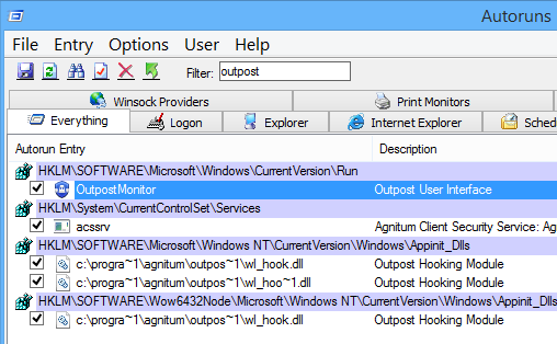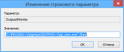 Если так, то в реестре в ключе HKEY_LOCAL_MACHINE\SOFTWARE\Microsoft\Windows\CurrentVersion\Run параметр OutpostMonitor должен выглядеть так