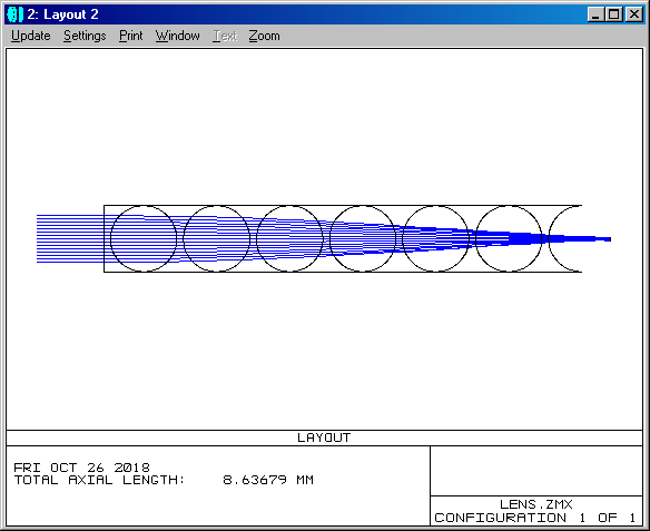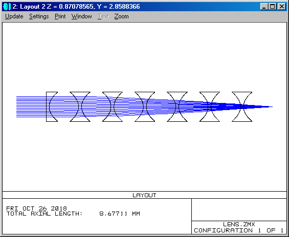 Диаметры линз равны 1 мм. Фокусировка в пятно на седьмом воздушном промежутке.