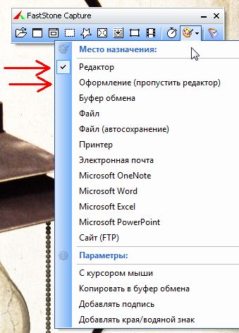 • Выбор, куда будет отправлено захваченное изображение (встроенный редактор, буфер обмена, файл, принтер...)
