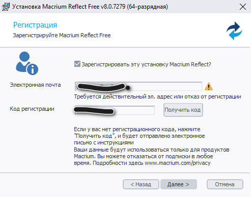 Тот код, который вы пытаетесь то ли получить на почту, то ли отправить, он для того, чтобы вы уведомили Macrium - привет, англичане, я Васька Табуреткин, я установил Free, мой идентификационный код такой-то, запишите меня в ваш список. От этого вам ни холодно, ни жарко, это ни на что не влияет, в общем, на всю почтовую переписку забейте.