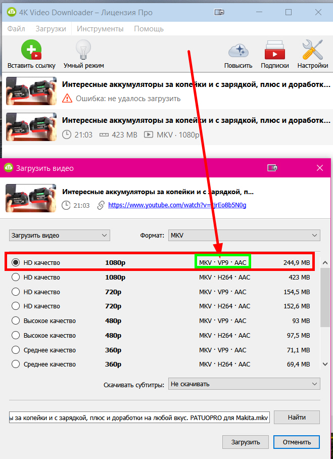 Вот скрин, при скачивании кодека VP9 1080p выдаёт ошибку.