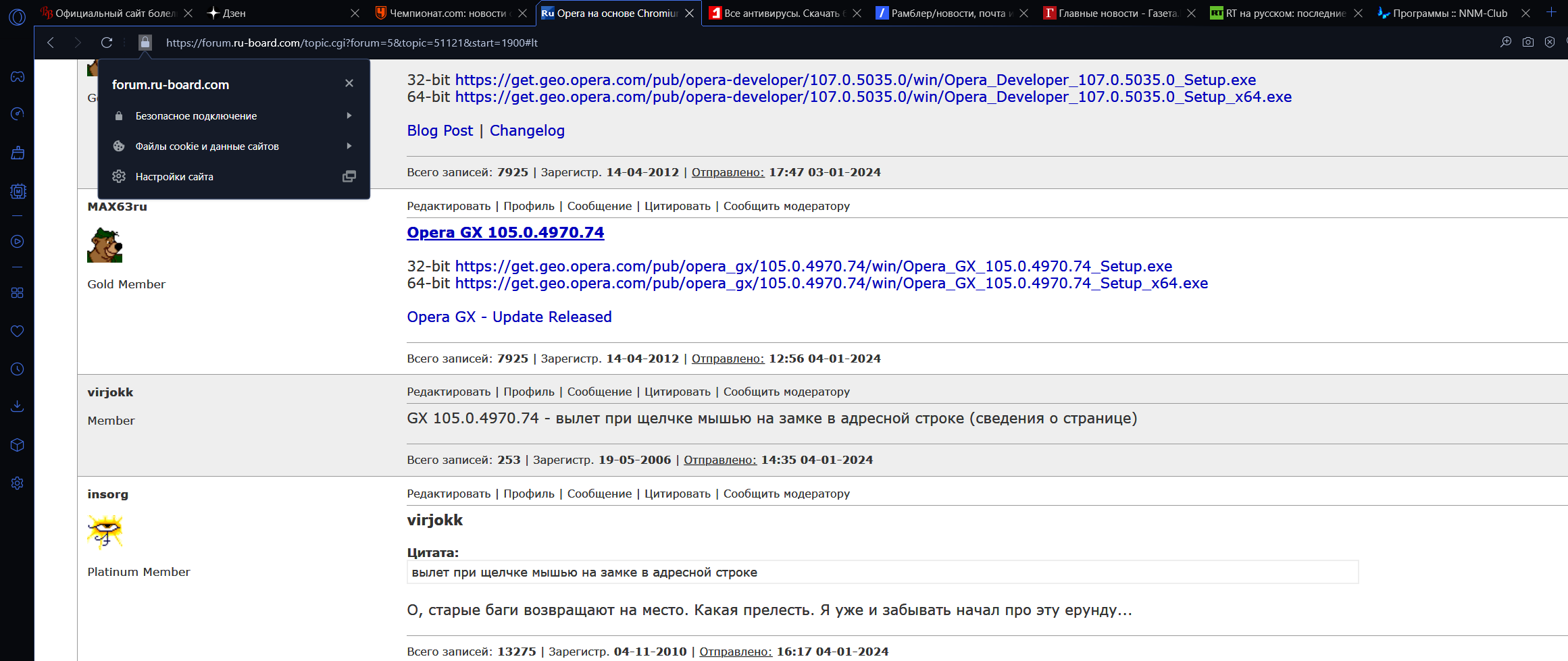 GX 105.0.4970.74 - вылет при щелчке мышью на замке в адресной строке (сведения о странице)