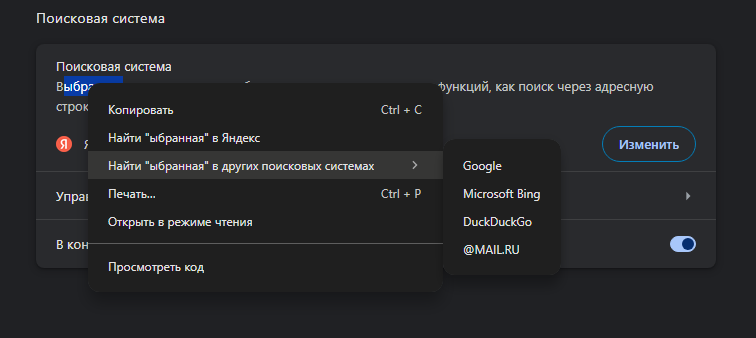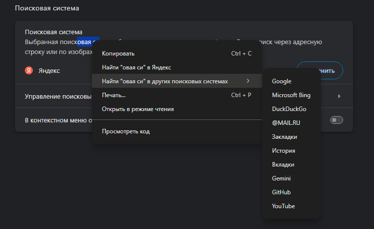 В центе (как пример) допустим есть галка, показывать в контекстном только поисковые по умолчанию https://a.i.getapic.me/mdve.png если её убрать, то покажет все https://a.i.getapic.me/mdva.png (но их может быть много) Вот что будет если удалить все кроме одной https://a.i.getapic.me/mdvi.png нету уже пункта поиска в контекстном, если только выключать галку и добавлять поисковые вниз по сайту. Для чего-то может понадобится в дефолтных поисковых системах чтобы были они.