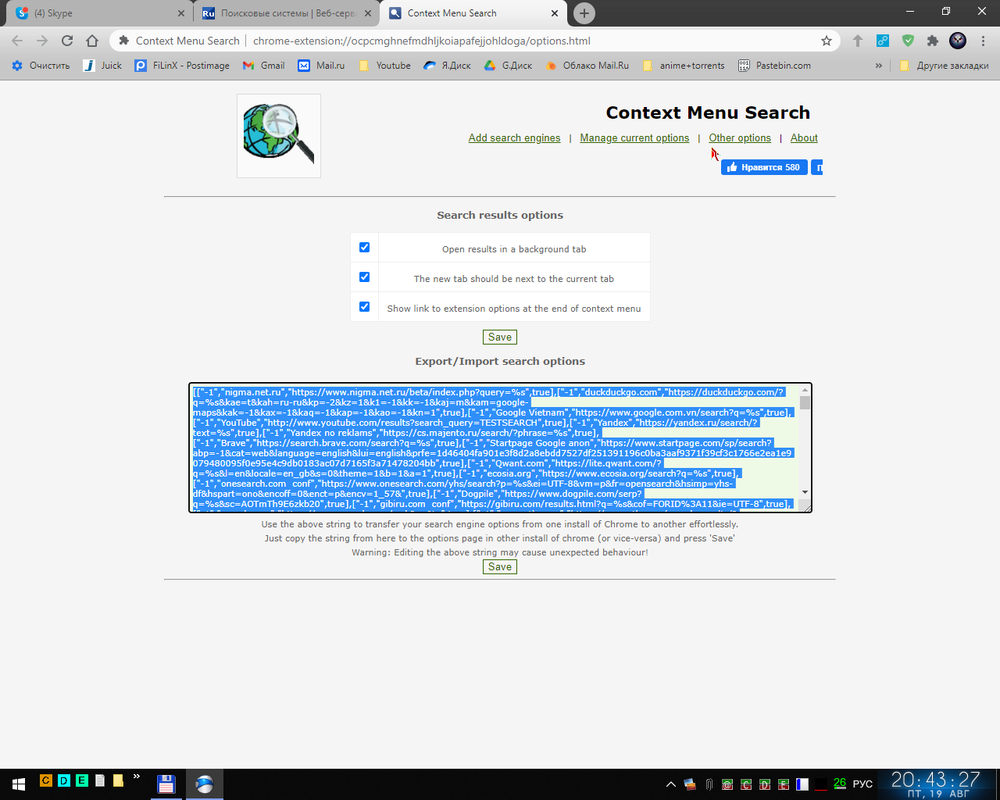 Silver Member | Редактировать | Профиль | Сообщение | Цитировать | Сообщить модератору Valivan77777 с зетфликсом всё работает, вот энжин: https://hd2.zetfix.online/index.php?do=search&subaction=search&story=%s а вот со стартпейджем не всё так просто, возможно что он требует тикетов под тебя настроенных.. по крайней мере мне пришлось сначало зайти туда на поиск, настроить там всё, чего-нибудь поискать, и вот уже тогда из адресной строки создать себе энжин, попробуй, мож и тебя прокатит: Подробнее... хех)) строка то супердлинная, и ломает вёрстку страницы форума) и кстати спасибо за вопрос, благодаря ему заметил, что вот такую сверхдлинную строку - расширение тоже не запоминает всю полностью когда через его окно добавления нового поисковика делаешь, и у меня там такая обкоцаная-нерабочая ссылка и сохранена блин была) но хорошо что её можно поправить в массиве импортируемых настроек, что я и сделал. | Всего записей: 3217 | Зарегистр. 05-05-2010 | Отправлено: 01:20 21-08-2022 | Исправлено: FiLinX, 01:28 21-08-2022 |
