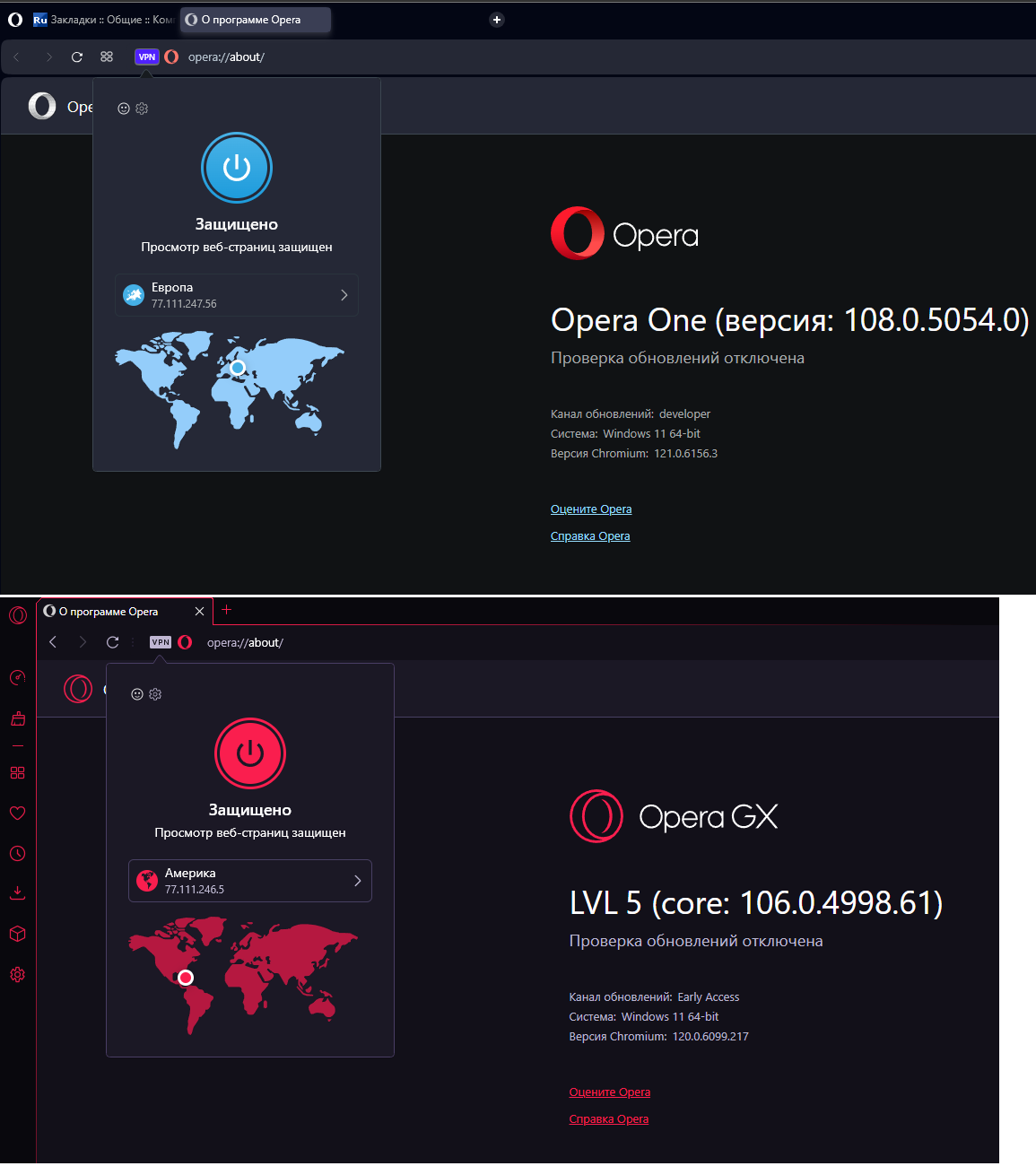 Что касается "на один зашёл, на второй нет", то это уже речь о функциональности Opera VPN. Есть немало сайтов, куда через оперовский прокси не пускают.