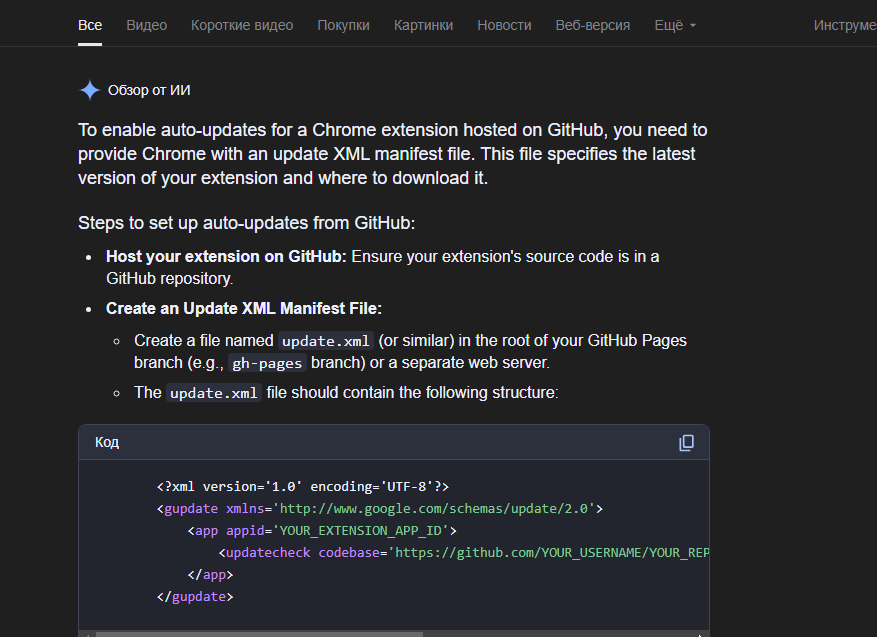 Platinum Member | Редактировать | Профиль | Сообщение | Цитировать | Сообщить модератору greeple Цитата: можно же прямо в манифесте добавить на свою страницу xml, не будет так обновляться? | о том и речь - "нет под рукой веб-ресурса, на котором я могу сделать всё, что/как мне хочется/можется принципиально".. хостинг сайтов на юкозе не даёт такой возможности (шоб прям совсем полноценно), ковыряли уже с коллегами эту тему.. поэтому всё на уровне простейших костылей делается.. и да - я не готов ради пары аддонов париться с другими хостингами и прочим.. Цитата: или в новых браузерах уже это не будет работать? | не будет, вроде как.. плотно не смотрел, но судя по тому, как другие гайки крутят - фигвам..) Цитата: на mv3 только на линуксе можно с сервака своего обновлять, а на винде только в реестре (надо проверить на свою страницу) | вот именно.. мне только линуха не хватало для полноты счастья..))) Цитата: у чедота так было, у эпика вот | и ква теперь? мне малоинтересны "частные" хромоклоны, а в целом на произвольном хромоноге такое не прокатит.. сюда же - придётся юзеру "впаривать" установку разрешающих политик для загрузки с "левых" сайтов.. не-не, плавали, знаем..)) Цитата: или это не просто xml, и там надо сервак хостить? | естессно, думаешь, я просто так сказал про "нет под рукой"?)) Цитата: чат гпт говорит что не надо, достаточно xml с ссылками на файлы, и чтобы сервер отдавал по https и чтобы с правильным mime application/x-chrome-extension (ну это если .crx то так и будет отдавать по умолчанию вроде) | .."алиса, а не дура ли ты набитая? ...моя база данных не содержит ответа на ваш вопрос..." ...на всякий случай - в порядке офтопа: https://yandex.ru/search/?text=падение+производительности+труда+разработчиков+с+помощью+искусственного+интеллекта Добавлено: AkulaBig Цитата: Просто поменять местами. crx через апвтообновлялку, crx3 вручную | те же в профиль, не? "завтра" придёт новый юзер, устанавливающий аддон в первый раз, и спросит - "какого, мол.." ну и т.д.) Цитата: У меня Цент, мне не нужен crx3 | ..а у меня хромиум-гост, а у петьки из соседнего двора - ваще китаец.. и как мне быть, шоб всем сразу угодить? Цитата: И все браузеры, где разрешена установка crx, будут автообновляться | а где не разрешена - там как? причём, "где НЕ" - таких большинство, просто люди не спрашивают - работает же..)) вопчем, ты чуток отодвинься от "своей колокольни" и попробуй смотреть шире - с т.з. принципиальной совместимости с ЛЮБЫМ хромом.. я ж не просто так сделал "дурацкое" переименование расширения файла, это самый простой и гарантированно рабочий способ.. вопчем, пока = не убедил, пока = будет как есть. не канает переименование = не пользуемся автообновлятором, качаем с сайта.