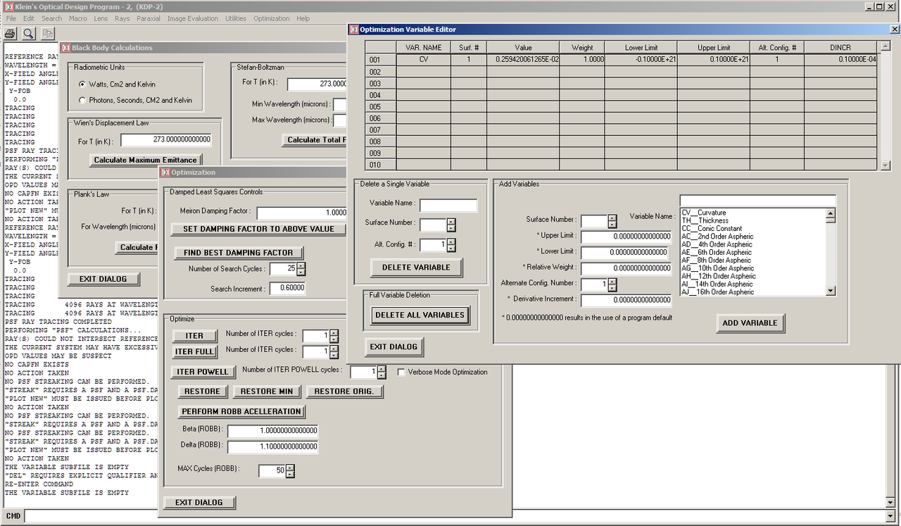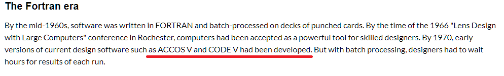 Advanced Member | Редактировать | Профиль | Сообщение | Цитировать | Сообщить модератору Aegis_I Цитата: Хих. Там не только разработчик не доступен, но и сама программа - HTTP 404.) Полагаю, что под термином "аберрационный анализ" там скрываются аберрации третьего порядка, хотя могу ошибаться. Впрочем, этого уже не узнать. ) Цитата: По скринам как-то подозрительно похожа на переделанный Земакс. ) Если загрузить буклет, то в конце есть таблица со сравнением LITE/PRO-версий. Lite-версия куцая. Точно Земакс перепаханный. Не то, короче.) А, вообще, если инструкция меньше нескольких сот страниц, то прога явно не может быть крутой. Скачайте инструкцию KDP-2 по ссылке, которую я привёл выше: https://yadi.sk/i/hXMAXZyXs8bYPw Сейчас будет суперприкол!!! Я смотрел инструкцию и дошёл до страницы 230. Увидел я там вот что - ЧИСТОСЕРДЕЧНОЕ ПРИЗНАНИЕ старого оптика! Это я сам подчеркнул красным. А в свою очередь программа HEXAGON как раз и была каким-то вариантом ACCOS-V, которым пользовались в Hughes Aircraft и Raytheon, причём она имела какие-то преимущества перед CODE-V. С сайта программы http://www.ecalculations.com/ Вот и получается, что KDP-2 является не прямым, но наследником ACCOS-V. Я до этого привёл ссылку на обзор развития оптических программ. Если кто её прочитал, то там как раз одновременно упоминаются ACCOS-V и CODE-V. https://www.laserfocusworld.com/articles/print/volume-51/issue-12/features/photonic-frontiers-optical-design-software-looking-back-looking-forward-the-growing-power-of-software-drives-photonic-innovation.html Так что, если говорить про абсолютно бесплатные нормальные программы, то это только KDP-2. (с долей иронии) Только кому она теперь такая нужна... Теперь всем графоний подавай. ) Я сделал скриншот программы. Если кто хочет посмотреть. В Земакс тоже бы было неплохо "Black body calculations" куда-нибудь запихать. | Всего записей: 1098 | Зарегистр. 05-05-2009 | Отправлено: 15:04 19-03-2019 | Исправлено: VECTORRR, 16:44 19-03-2019 |