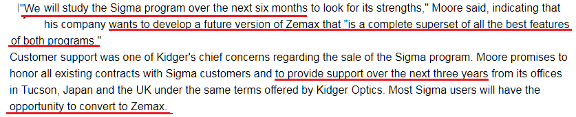 Advanced Member | Редактировать | Профиль | Сообщение | Цитировать | Сообщить модератору quantum12345 Цитата: Если можно покритикуйте с глобальной точки зрения выбранные решения. | Скорее всего вы как-то упрощённо всё же нарисовали, но, в принципе, понятно как работает. Просто когда в одном канале приёмник и осветитель, то могут быть какие-то блики в изображении от обратных переотражений лазера, так как одни и те же компоненты работают и на подсветку и на приём. Но это предположение, так как всё зависит от конкретной схемы. Вот ещё интересно, а будет ли "бублик" в пятне подсветки, так как центральная часть перекрывается малым зеркалом? Ну, может быть и не такой выраженный "бублик", но в центральной части может быть какой-то спад, не знаю. А у малого зеркала по центру какой диаметр? paparazzo Цитата: Ну и в таком виде будут покупать, всяко дешевле Zemax. | Даже с запакованным в установщике трояном внутри? Добавлено: paparazzo Цитата: Zemax дорастёт до уровня CodeV, по цене уж точно. | Пфф. Ну, так всё и задумывалось. Сначала типа малой ценой привлечь клиентов, потом скупить другие программы, а после того как альтернативы не осталось, то добавить к ценнику ноль или даже два ноля. Возможно, что Земакс для этого изначально и был придуман Кеном Муром, для того чтобы "принт мани". Добавлено: Кстати, кто-нибудь когда-нибудь проводил прямое сравнение результатов, которые выдают программы? Казалось бы, всё давно написано в книгах и результаты должны быть у всех одни. Действительность оказывается несколько иной. Похоже, что каждый автор программы имеет на все формулы несколько различный взгляд. По-разному считают аберрации (похоже, что Земакс неправильно): Цитата: I noticed different results for W220 from OSLO and Zemax after I had read the book. Probably I should not have considered W220 the contribution to the wavefront from Petzval field curvature. OSLO uses the equation W220=(SIII+SIV)/4 to get W220, on the other hand W220=SIV/4 is used to calculate W220 in Zemax. | Земакс криво считает FFT MTF при относительных выше F/1.5, в отличии, как я понял, от других программ (CODE). (о чём даже написано в инструкции. В таком случае при больших относительных надо использовать Гюйгенс, как я понял). Цитата: Try MTF of an off axis parabolic reflector. Clear aperture 5 units. EFL 2.5 units. This give an f/0.5 parabola. Now off-set the aperture by 2.5 units and compare the MTF in CODE-V with that of ZEMAX. If they agree, Ken fixed the pupil distortion problem. If not he didn't. CODE-V gives the correct answer. I have not run a test in OSLO. Zemax does not account for vector diffraction, the MTF data may not be accurate for systems faster than about F/1.5." This can be corrected for by accounting for the distortion in the exit pupil. In many programs when rays are aimed, they go to a uniform grid in the stop surface. If that does not map to a uniform grid in direction cosine space in the exit pupil, you don't get the right MTF answer if the MTF is based on the complex aperture function. You also don't get the correct PSF!. I fixed it in Roadrunner in a manner equivalent to CODE-V's fix (remapping the pupil to represent a unifom grid in direction cosine space either at the entrance or exit pupil considering in which space the calc is being performed) and it has nothing to do with VECTOR DIFFRACTION. It has to do with writing a decent optical design program. This also corrects the fact that even if the entrace pupil is uniformly illuminated, the exit pupil may not be. (For those smart enough, this is called apodization). Can we all spell APODIZATION? Let's have that be your new word for the day. I personally think anyone who would spend $1000 or $2000 or $3000 on an optical design program that does not give correct MTF answers for systems faster than f/1.5 is a complete ... and anyone who would charge this much for a code with these difficulties is not interested in optics or science. They are just interested in how well they can line their pockets with your money. | Я не удивлюсь, если Синопсис вообще выдаёт какой-нибудь третий результат. Как я понял, "особенности" программ могут появиться при высоких относительных. Может кто-нибудь и сравнит программы когда-нибудь. | Всего записей: 1098 | Зарегистр. 05-05-2009 | Отправлено: 05:20 04-04-2019 | Исправлено: VECTORRR