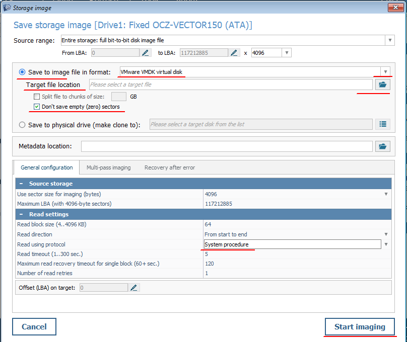 • Выбор места хранения готового образа (на локальном жестком диске, на сетевом диске или оптическом носителе);