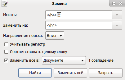 Пытаюсь через "заменить всё" удалить пустую строку после каждого тега </h4>.