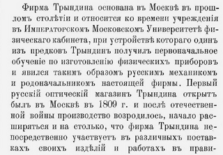 Advanced Member | Редактировать | Профиль | Сообщение | Цитировать | Сообщить модератору Aegis_I Цитата: интересные статейки попадаются про ситуацию на предприятиях в отрасли, вопрос только насколько они близки к истине | Можете почитать ссылки, которые будут в конце моего сообщения. Можно швабнуться по мере прочтения. Как я говорил ранее, довольно случайно нашёл посвящённым истории появления опт. фирм в России сайт http://optic10.narod.ru/ , главная страница которого сейчас только в интернет-архиве : http://web.archive.org/web/20180928113810/http://optic10.narod.ru/ Мне стало интересно узнать кто был автор этого сайта. На главной странице там всё написано: "Создание, дизайн, концепция и развитие проекта - Евгений Трындин. tryndin@yandex.ru " Видя фамилию автора сайта я немного подвис... Ведь первая опт. фирма в Российской Империи, которая самая первая стоит в списке на сайте, носила название "Е.С. Трындина Сыновей" Получалось, что автор сайта из рода Трындиных, которые ещё в конце 18-го века по сути стали первыми оптиками Российской Империи в промышленном масштабе. Цитата: Судя по источникам XIX в. Трындины были первыми русскими оптиками, открывшими свою мастерскую в России после того, как 21 апреля / 2 мая 1785 г. императрица Екатерина II даровала самостоятельные права ремесленно-му сословию и ввела цеховое деление. | Это сделал сам Трындин, а продолжили потом его сыновья. https://ru.wikipedia.org/wiki/Трындины ФИРМА ТРЫНДИНЫХ В ИСТОРИИ РОССИЙСКОЙ АСТРОНОМИИ http://tryndin.narod.ru/Astronom.htm Собственно, а вот и второй сайт, который потомок Трындиных создал: http://tryndin.ru/ http://tryndin.narod.ru/ Обратите внимание, сайты немного отличаются. Похоже, что один более обновлённый. Написано там много, но можно хотя бы слева на сайте поочерёдно понажимать ссылки-заглавия и посмотреть картинки для получения представления. Там картинки продукции, фото цехов, зданий и прочее. Даже каталоги есть: http://tryndin.narod.ru/Catalog.htm Отсюда: https://dlib.rsl.ru/viewer/01003636914#?page=1 Автор книжку написал в честь 200-летнего юбилея: Трындин, Евгений Николаевич. Фирма Трындиных : "… прилагать все силы к успеху и процветанию…" / Е. Н. Трындин, С. Г. Морозова ; М-во культуры Российской Федерации, Политехнический музей. - Москва : Политехнический музей, 2011. - 255 с _____________________ Я всё не читал, просто быстро пробежался и понял, что вся эта история с переименованиями в "швабы" является попыткой недалёкого ума людей соответствовать чему-то там, что существует в их воображении. Подумали, что если назовутся австрияками, то это решит все проблемы в отрасли и бабки поплывут рекою. Назвать себя "Холдинг Трындин" - это западло, так как не по западному звучит, а вот назвать себя какой-то "шваброй" - это зашибись, креативно, молодёжно и современно. И не важно, что этот австрияка Шваба прибыл в Россию только с одной целью для выкачивания бабок из России, ибо что ещё нужно иностранцам от России. Понятное дело, что у него на родине конкуренция большая, вот он и приехал в Россию, но только в России и без него уже были оптики и магазины оптики. А на официальном сайте "Швабе" так понаписано, что будто этот продаван очков в магазине "за углом" так вообще является родоначальником всего опт. производства в России, иначе как ещё можно объяснить его имя на вывеске. Пару слов про ЦКБ "Точприбор". Его переименовали в "Швабе - приборы". Вот спрашивается зачем? Сам ЦКБ "Точприбор" располагается на территории "Приборостроительного завода НПЗ". Как я