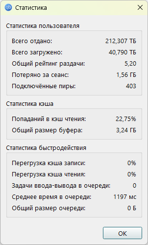 3. А вот с изменением кеша диска в памяти на 512 мб начинается самое интересное. "Прожорливость" клиента снижается, это да. Но падает количество активных торрентов и скорость отдачи сильно снижается. Пришлось вернутся на отметку -1 (автоматически). "Прожорливость" клиента увеличилась, но и скорость отдачи при этом стоит на максимуме возможности моего канала.