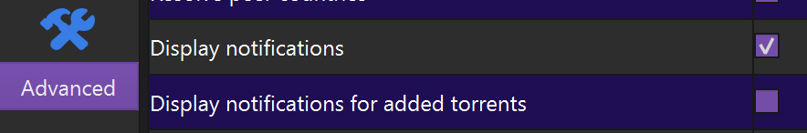 В расширенных настройках. Только в 5-х версиях толку от них практически нет, так как в списке уведомлений они не остаются, в отличие от предыдущих версий qBittorrent.