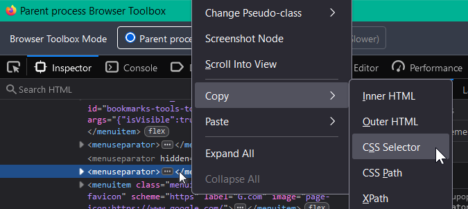 А если в Browser Toolbox ПКМ > Copy > CSS selector?