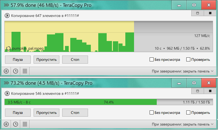 • Возможность приостановить и возобновить процесс копирования или перемещения