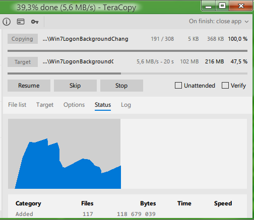 TeraCopy — компактная программа, разработанная для копирования и перемещения файлов с максимальной скоростью. Программа оптимизирует процесс копирования за счёт использования дополнительного буфера и многопоточного алгоритма. TeraCopy позволяет останавливать и возобновлять копирование информации, повторять попытки записи при обнаружении ошибок или пропускать обработку отдельных файлов. Программа имеет интерактивный список копирования в котором файлы, которые не удалось скопировать, отмечаются соответствующей иконкой, что позволяет пользователю быстро определить и исправить ошибку. TeraCopy интегрируется в контекстное меню проводника и заменяет стандартный диалог копирования.