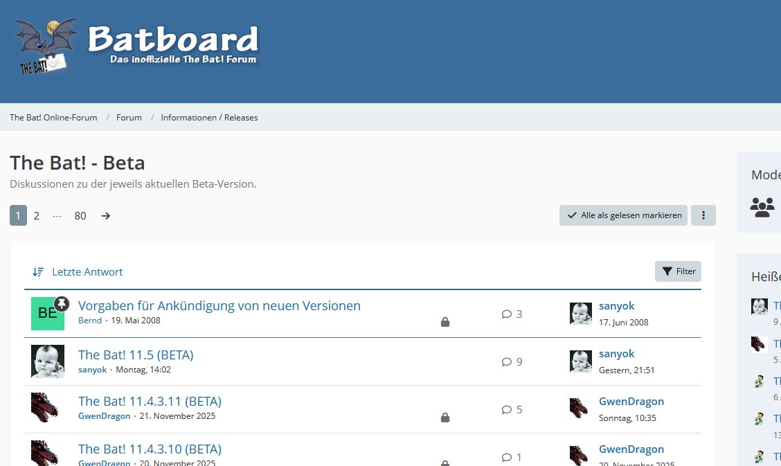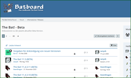 Дед Мазай | Редактировать | Профиль | Сообщение | Цитировать | Сообщить модератору Прошлые части топика Поиск ключей в Варезнике Прежде чем спрашивать ознакомьтесь с RU-Board The Bat! FAQ The Bat! The Bat! Professional - один из самых популярных среди русскоязычных пользователей почтовый клиент. Это функционально расширенная версия, которая позволяет работать с неограниченным количеством почтовых ящиков (по протоколам IMAP4, POP3, APOP и SMTP), имеет настраиваемую систему фильтров, продвинутый редактор текста с форматированием, шаблоны сообщений и "быстрые шаблоны", умеет проверять орфографию и поддерживает PGP. Кроме этого, диспетчер писем может работать с ними прямо на сервере (без загрузки на компьютер пользователя), имеется записная книжка, функция дозвона и утилита для просмотра графических файлов. Как задавать вопросы в этом топике. Читать обязательно! Практика показывает, что большинство вопросов повторяется, например, по заморочкам с Gmail.com и Yandex.ru. Так что, скорее всего, ваш вопрос уже задавался недавно и, возможно, на него уже дали исчерпывающий ответ Если поиск не помог, то переходим к следующему этапу. КАК ЗАДАТЬ ВОПРОС И ПОЛУЧИТЬ ОТВЕТ ИНСТРУКЦИЯ Отличия версий Home и Professional Страница загрузки The Bat! The Bat! v11.4.3 (14.08.2025) | Хронология изменений Внимание! Установку альф/бет производите на свой страх и риск. Если что не так - сами себе злобные Буратино! Еще один источник беток TB Антиспам-плагины: AntispamSniper плагин - мощная защита от спама, удаляющая спам непосредственно с сервера Дополнительно | Всего записей: 39724 | Зарегистр. 26-02-2002 | Отправлено: 20:11 18-03-2024 | Исправлено: copsmith, 09:31 03-11-2025 |