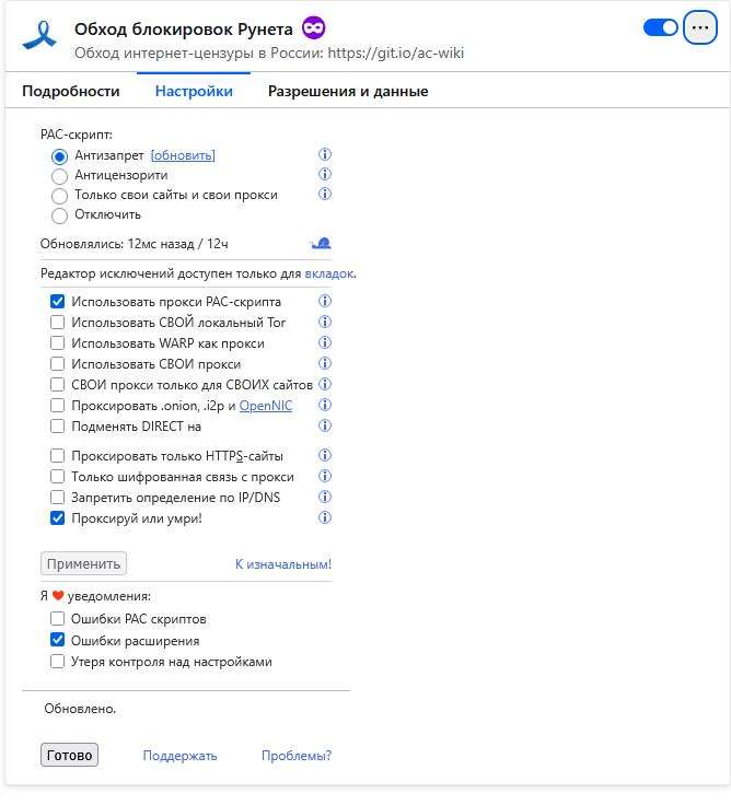 Silver Member | Редактировать | Профиль | Сообщение | Цитировать | Сообщить модератору Yankell Цитата:| Пользуюсь FoxyProxy+впн типа тор, hiddify, etc, там можно списки настроить, что пускать с впн, а что мимо. | Есть рабочая схема, без мути ? если схема полуприватная , можно в ПМ даже скинуть, мне главное, чтоб ватсап работал. Сегодня пришлось через ТОР браузер уже зайти, но там очень не удобно. каждый раз заново ввести QR код и тд. Добавлено: stvol333 Цитата:| Расширение позволяет обходить только блокировки РосКомНадзора. | например, какой сайт тогда РКН блокривал? давайте попробую. Цитата:| Ни Ютуба, ни Вотсапа в этих списках, по моему, нет (т.к., официально они не блокируются). | это новая схема нае** народа? типа мы не причем, само по себе так стало ? Цитата:| Если расширение не работает: | Ну надо понять на самом деле плагин не работает или просто как вы сказали, ватсап и ютуб там нету просто.