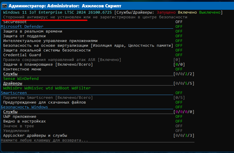 Junior Member | Редактировать | Профиль | Сообщение | Цитировать | Сообщить модератору Schmalz На гитхабе есть краткое русское описание https://github.com/lostzombie/AchillesScript/blob/main/README_local.md Там же всегда актуальная версия. Про окончательность не понял. На данный момент скрипт функционален от w10 1809 (ниже просто лень проверять) до w11 26220.6772. Но это не значит что скрипт не будет работать на более новых билдах или то что он не перестанет работать на текущих билдах с обновлением самого защитника и появлением новых сущностей в его составе. Отключение новых сущностей добавляется всегда с обратной совместимостью, т.е. всегда оставляю проверку наличия уже неактуальных штук для старых билдов. Текущий метод это автоматизация перезагрузки в безопасный режим, пока эту возможность не прикрыли и структура служб и драйверов защитника не поменялась кардинально скрипт будет работать. В планах только следить за изменениями, и доработать редко встречающиеся в реальном мире штуки и дополнительные функции типо ручное отключение настроек заблокированных в uefi, меню перезагрузки в uefi, safe mode, нормально, меню запуска от trusted installer cmd.exe, regedit.exe, powershell.exe, отключение политик цифровой подписи (cipolicies) как опция, вон как упомянуто выше добавить в 4й избыточный пресет блокировку служб через сломанную зависимость. Добавлено: oval2003, это давно было? В текущей версии есть счётчик перезапусков для получения прав админа, триггером наличие прав является выполнение команды bcdedit без параметров и без ошибок. Встречал системы где UAC поломан и в части популярных способов проверки наличия прав админа они якобы есть, а вот bcdedit выдавал что доступа нет. Сами права получаются с помощью powershell start-process. Предположу что проблема не в вырезанном защитнике, а в поломанном UAC, попробуйте вернуть ползунок контроля учетных записей в дефолт, перезагрузится и выключить UAC именно ползунком вниз, а не твикерами. Ну и можно проверить предвариткльно что в консоли напишет команда bcdedit, выдаст список загрузочных записей или ругнется. Так же она может ругаться с поломанным efi разделом, даже если всё грузится нормально, bcdedit может не понимать где хранилище по умолчанию. Это так навскидку. |