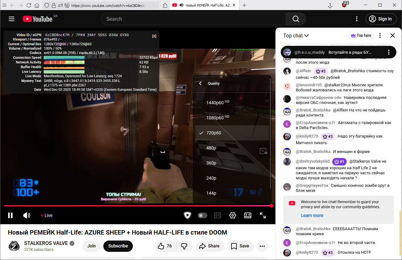 Platinum Member | Редактировать | Профиль | Сообщение | Цитировать | Сообщить модератору Stasx Цитата: Есть же 95 - те же яйца, только в профиль. [youtube] Extracting URL: https://www.youtube.com/watch?v=KsLrSPZQBOA [youtube] KsLrSPZQBOA: Downloading webpage WARNING: [youtube] No supported JavaScript runtime could be found. YouTube extraction without a JS runtime has been deprecated, and some formats may be missing. See https://github.com/yt-dlp/yt-dlp/wiki/EJS for details on installing one. To silence this warning, you can use --extractor-args "youtube:player_client=default" [youtube] KsLrSPZQBOA: Downloading android sdkless player API JSON [youtube] KsLrSPZQBOA: Downloading web safari player API JSON WARNING: [youtube] KsLrSPZQBOA: Some web_safari client https formats have been skipped as they are missing a url. YouTube is forcing SABR streaming for this client. See https://github.com/yt-dlp/yt-dlp/issues/12482 for more details [youtube] KsLrSPZQBOA: Downloading m3u8 information WARNING: [youtube] KsLrSPZQBOA: Some web client https formats have been skipped as they are missing a url. YouTube is forcing SABR streaming for this client. See https://github.com/yt-dlp/yt-dlp/issues/12482 for more details [SponsorBlock] Fetching SponsorBlock segments [SponsorBlock] Found 3 segments in the SponsorBlock database [info] Available formats for KsLrSPZQBOA: ID EXT RESOLUTION FPS CH | FILESIZE TBR PROTO | VCODEC VBR ACODEC ABR ASR MORE INFO ------------------------------------------------------------------------------------------------------------------------------ sb3 mhtml 48x27 0 | mhtml | images storyboard sb2 mhtml 80x45 0 | mhtml | images storyboard sb1 mhtml 160x90 0 | mhtml | images storyboard sb0 mhtml 320x180 0 | mhtml | images storyboard 139-drc m4a audio only 2 | 35.75MiB 49k https | audio only mp4a.40.5 49k 22k [ru] low, DRC, m4a_dash 249-drc webm audio only 2 | 37.20MiB 51k https | audio only opus 51k 48k [ru] low, DRC, webm_dash 139 m4a audio only 2 | 35.75MiB 49k https | audio only mp4a.40.5 49k 22k [ru] low, m4a_dash 249 webm audio only 2 | 36.99MiB 50k https | audio only opus 50k 48k [ru] low, webm_dash 140-drc m4a audio only 2 | 94.89MiB 129k https | audio only mp4a.40.2 129k 44k [ru] medium, DRC, m4a_dash 251-drc webm audio only 2 | 93.97MiB 128k https | audio only opus 128k 48k [ru] medium, DRC, webm_dash 140 m4a audio only 2 | 94.89MiB 129k https | audio only mp4a.40.2 129k 44k [ru] medium, m4a_dash 251 webm audio only 2 | 91.83MiB 125k https | audio only opus 125k 48k [ru] medium, webm_dash 91 mp4 256x144 30 | ~107.03MiB 146k m3u8 | avc1.4D400C mp4a.40.5 [ru] 160 mp4 256x144 30 | 12.47MiB 17k https | avc1.4d400c 17k video only 144p, mp4_dash 278 webm 256x144 30 | 34.65MiB 47k https | vp9 47k video only 144p, webm_dash 394 mp4 256x144 30 | 25.92MiB 35k https | av01.0.00M.08 35k video only 144p, mp4_dash 92 mp4 426x240 30 | ~175.46MiB 239k m3u8 | avc1.4D4015 mp4a.40.5 [ru] 133 mp4 426x240 30 | 22.17MiB 30k https | avc1.4d4015 30k video only 240p, mp4_dash 242 webm 426x240 30 | 27.92MiB 38k https | vp9 38k video only 240p, webm_dash 395 mp4 426x240 30 | 24.49MiB 33k https | av01.0.00M.08 33k video only 240p, mp4_dash 93 mp4 640x360 30 | ~350.31MiB 478k m3u8 | avc1.4D401E mp4a.40.2 [ru] 134 mp4 640x360 30 | 39.39MiB 54k https | avc1.4d401e 54k video only 360p, mp4_dash 18 mp4 640x360 30 2 | 239.38MiB 327k https | avc1.42001E mp4a.40.2 44k [ru] 360p 243 webm 640x360 30 | 59.53MiB 81k https | vp9 81k video only 360p, webm_dash 396 mp4 640x360 30 | 43.33MiB 59k https | av01.0.01M.08 59k video only 360p, mp4_dash 94 mp4 854x480 30 | ~490.47MiB 669k m3u8 | avc1.4D401F mp4a.40.2 [ru] 135 mp4 854x480 30 | 61.27MiB 84k https | avc1.4d401f 84k video only 480p, mp4_dash 244 webm 854x480 30 | 97.07MiB 132k https | vp9 132k video only 480p, webm_dash 397 mp4 854x480 30 | 72.65MiB 99k https | av01.0.04M.08 99k video only 480p, mp4_dash 95 mp4 1280x720 30 | ~913.20MiB 1246k m3u8 | avc1.4D401F mp4a.40.2 [ru] 136 mp4 1280x720 30 | 97.33MiB 133k https | avc1.4d401f 133k video only 720p, mp4_dash 247 webm 1280x720 30 | 213.40MiB 291k https | vp9 291k video only 720p, webm_dash 398 mp4 1280x720 30 | 141.92MiB 194k https | av01.0.05M.08 194k video only 720p, mp4_dash 96 mp4 1920x1080 30 | ~ 2.03GiB 2837k m3u8 | avc1.640028 mp4a.40.2 [ru] 137 mp4 1920x1080 30 | 477.45MiB 651k https | avc1.640028 651k video only 1080p, mp4_dash 248 webm 1920x1080 30 | 417.37MiB 569k https | vp9 569k video only 1080p, webm_dash 399 mp4 1920x1080 30 | 274.40MiB 374k https | av01.0.08M.08 374k video only 1080p, mp4_dash 271 webm 2560x1440 30 | 1.13GiB 1576k https | vp9 1576k video only 1440p, webm_dash 400 mp4 2560x1440 30 | 941.98MiB 1285k https | av01.0.12M.08 1285k video only 1440p, mp4_dash 313 webm 3840x2160 30 | 3.46GiB 4840k https | vp9 4840k video only 2160p, webm_dash 401 mp4 3840x2160 30 | 1.95GiB 2725k https | av01.0.12M.08 2725k video only 2160p, mp4_dash Добавлено: Nimbussr Цитата:| сокращение от "dynamic range compression". | Если это так, то больше похоже на просто дополнительную дорогу для включенной галочки "стабле волюм" в настройках плеера. Уж очень хорошо сходится наличие одного с другим. | Всего записей: 20359 | Зарегистр. 04-11-2010 | Отправлено: 01:52 04-12-2025 | Исправлено: insorg, 01:55 04-12-2025 |