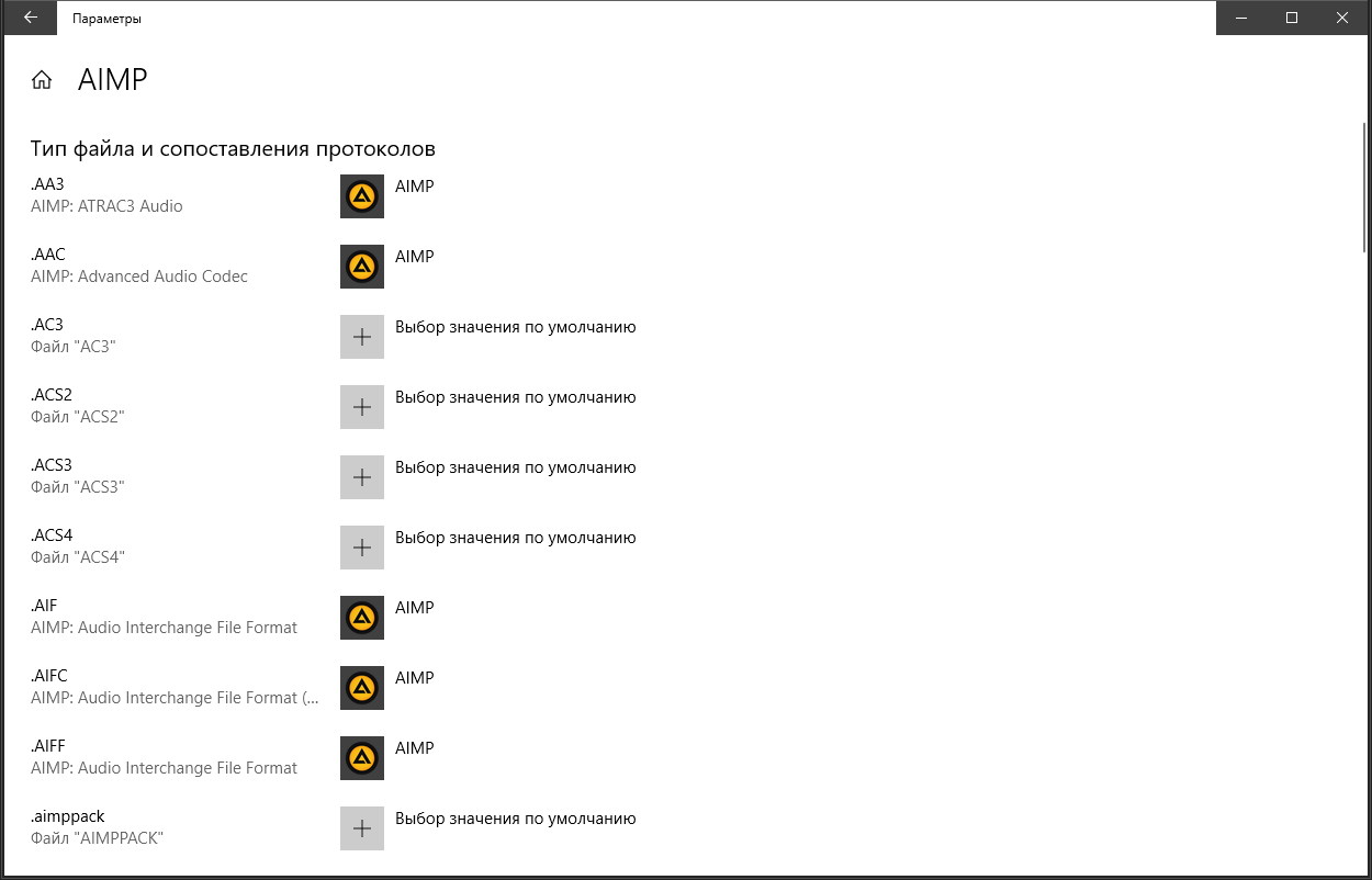 В 1703 и ниже было удобно выбрать AIMP и внизу нажать по умолчанию для всех типов файлов, и все расширения подхватывались автоматом.