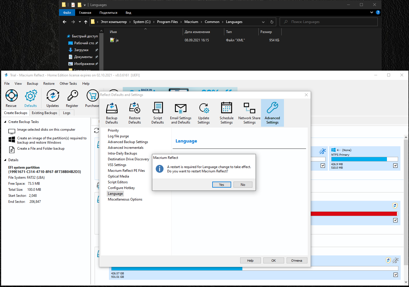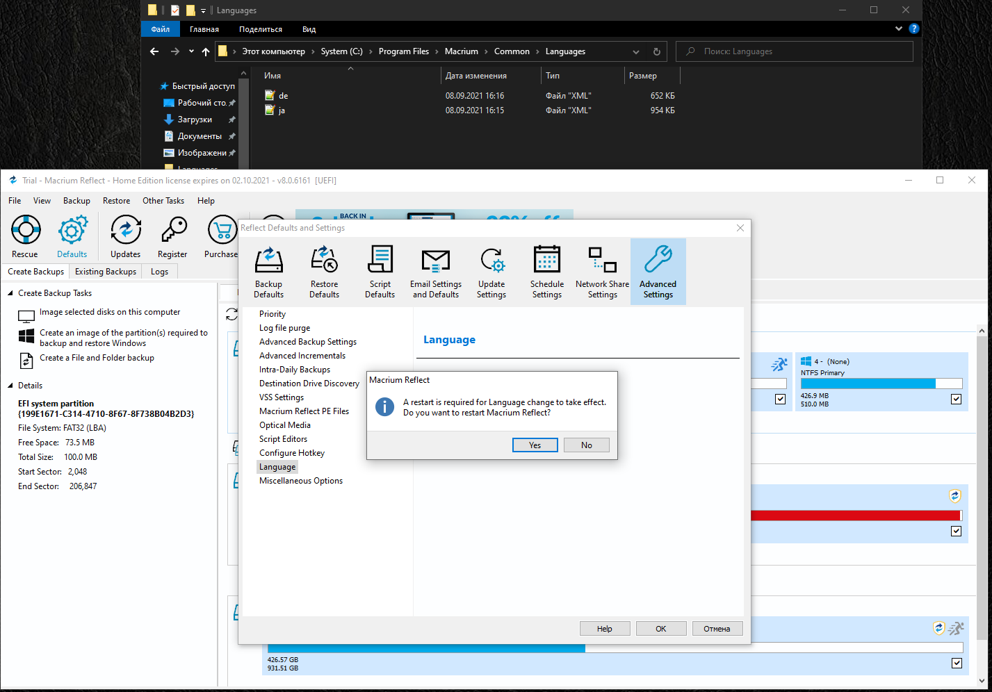 Языковый файл Русского перевода 'ru.xml' копировать в папку с программой C:\Program Files\Macrium\Common\Languages