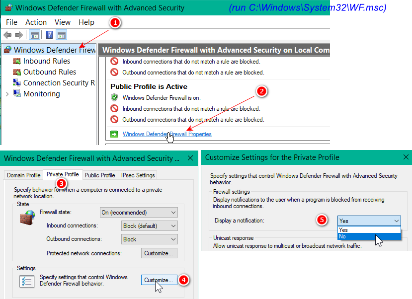 Оповещения безопасности Windows отображаются для не-Windows программ, которые пытаются принять входящие соединения, и эти входящие соединения блокируются. Чтобы отключить\включить эти оповещения (по умолчанию они включены), откройте Windows Firewall with Advanced Security (или запустите WF.msc) и отключите их для каждого местоположения (профиля)