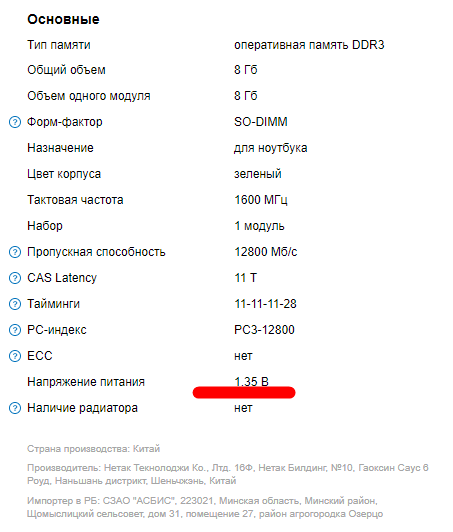 Junior Member | Редактировать | Профиль | Сообщение | Цитировать | Сообщить модератору Помогите, пожалуйста, подобрать RAM для ноутбука HP 255 G3 Rammon определяет память В наличие есть несколько модулей 8 гига Оперативная память DDR3 Netac NTBSD3N16SP-08 DDR3 Dahua DHI-DDR-C160S8G16 с такими же параметрами. Сомнения вызывает напряжение 1.35v Хотя у ноута указаны оба напряжения 1,5 и 1,35v. Будет ли она работать у меня? Есть ещё варианты с 1,5v DDR3 Indilinx IND-ID3N16SP08X DDR3 GeIL GS38GB1600C11S Какую модель и с каким напряжением выбрать? Понимаю, что 1,35 лучше, но подойдёт ли она к моему старенькому ноуту? |