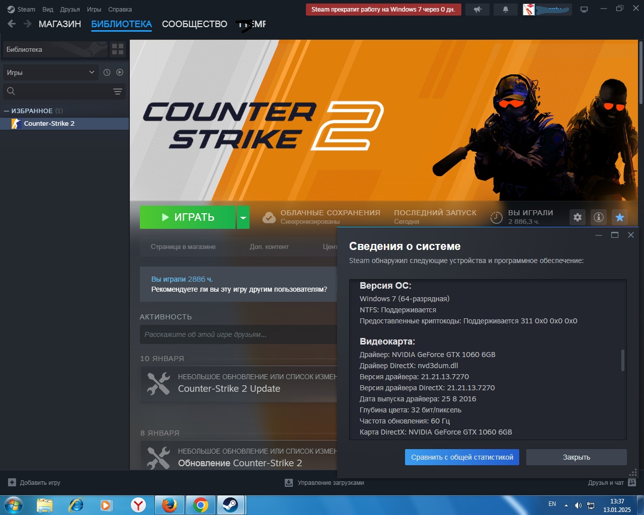 Advanced Member | Редактировать | Профиль | Сообщение | Цитировать | Сообщить модератору Cтим вроде как прекратил поддержку операционной системы Windows 7, такое уведомление видят пользователи windows 7 в окне программы. Но CS2 работает, запускается, обновляется, так что можно поиграть. Вот месяц назад, у меня была проблема с запуском CS2, игра запускалась и в самом начале при заставке вылетала ошибка, что типа обновите стим, нажимал ОК, и игра закрывалась. При выборе в настройках стим "Проверить наличие обновлений клиента стим", было сообщение что вы используете последнюю версию клиента стим, обновление не требуется. Выходил и заново заходил в стим, результата не было, CS2 после запуска выдавала ошибку. И вот на днях, полностью удалил стим, через Revo Uninstaller, вместе со всеми играми, и скачал с их сайта новый установщик стим, запустил, стим установился, далее запустил процесс установки CS2, часа два где-то устанавливалась (где-то 40 Гб распаковывалось). По окончанию установки, запустил CS2 и.. к моему удивлению игра запустилась, успешно проигралась заставка, после чего открылось главное меню, там некоторые персональные настройки клавиш слетели, но главное, игра нормально "работает", проверил, зашел в соревновательный режим, поиграл, удивился что все хорошо работает, даже лучше чем было, не зависает, не дергается, короче все хорошо. Один раз при запуске было сообщение что драйвер вашей видеокарты устарел, вышел новый, обновите, но я нажал пропустить. Т.к. вполне устраивает официально выпущенный один из ранних, первых драйверов, версия 372.70, скачанный с сайта производителя видеокарты Asus Dual-GTX1060-O6G. В этой версии как раз еще телеметрии Nvidia не было, не встраивали в установщик драйвера. Цитата: Посмотрим как будет дальше, как видно, после очередного обновления steam, или скорее для самой игры CS2, может перестать запускаться, не работать, около месяца, а потом, когда уже не ждешь, после очередного обновления, точнее чистой переустановки steam и CS2, игра может опять "работать", и даже еще лучше чем до переустановки, не тормозить, не лагать. Для меня важно, что достаточно хорошо работает и со "старой", проверенной временем, официальной версией драйвера 372.70 от 30 августа 2016 года, с сайта производителя видеокарты. | Всего записей: 824 | Зарегистр. 06-01-2009 | Отправлено: 23:02 17-07-2024 | Исправлено: hgvghvgh, 23:21 17-07-2024 |