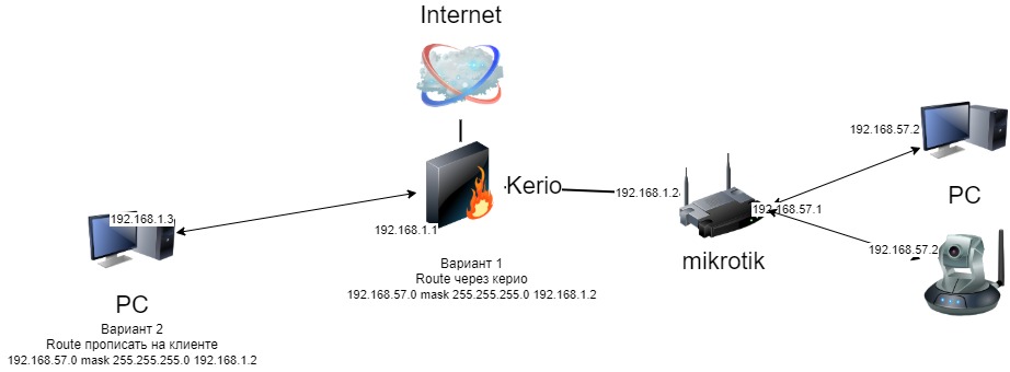 но если на компе локалки оставлять шлюзом керио, но в CMD прописать руками маршрут для 57.х ссылая все обращения на микротик в обход керио, то как я уже говорил всё работает замечательно.