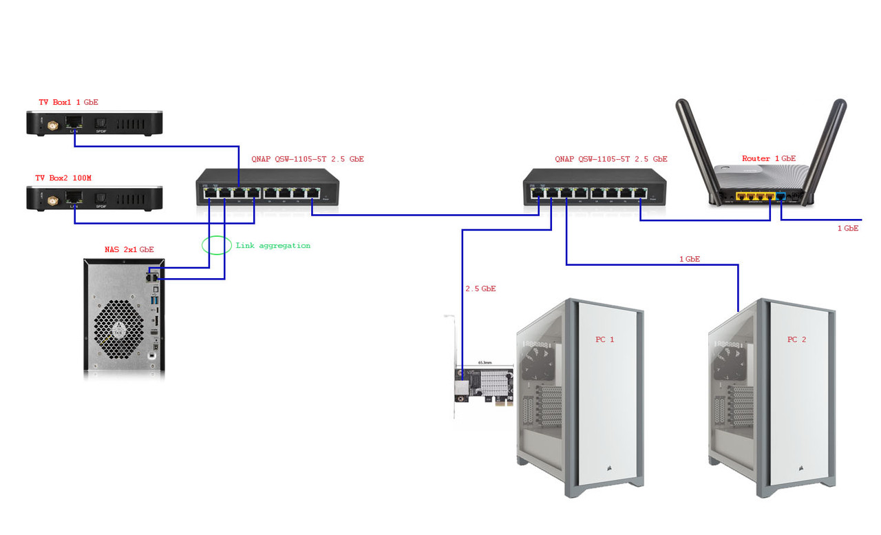 Newbie | Редактировать | Профиль | Сообщение | Цитировать | Сообщить модератору Если всё заагрегировать и свичи между собой и свичи с насом и пс. И прирост сильный не будет, так как арегация больше нужна для стабильности связи чем скорости. Передача одного потока идёт по одному кабелю и свитч выбирает куда направлять. Он не распараллеливает передачу. Если начнёшь передавать 2 файла то скорей всего они пойдут по разным проводам. Но Эти каналы могут использовать и другие устройства и пропускная способность уменьшится. Если отключить все внешние устройства и оставить только свичи и компы, то можно потестить и добиться превышение гигабита. И ещё всё это может оказаться трудно настраиваемым. Из за разных брендов и систем. Сетевые карты могут не поддерживать нужный протокол или поддерживать с нюансами которые придётся выяснять и решать. Если прям нужно соединить два устройства, то можно создать для них отдельную сеть не связанную с внешней. Обычно так делают чтобы гонять внутренний трафик или чтобы не мешали внешние потоки данных. |