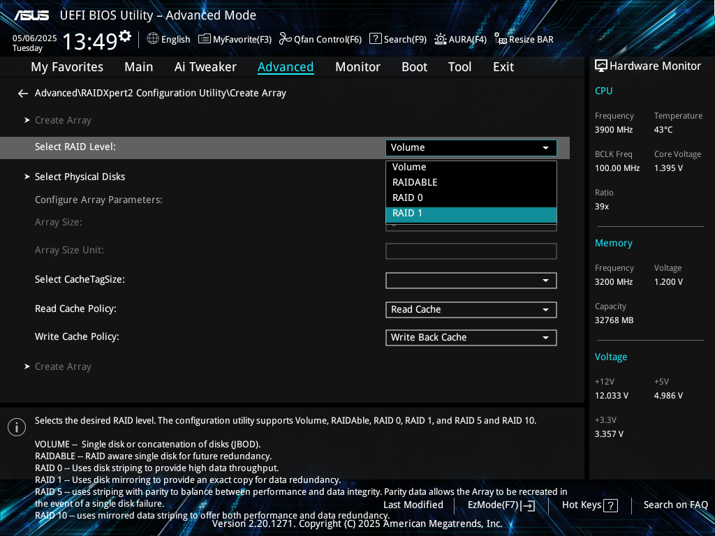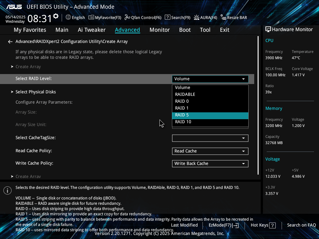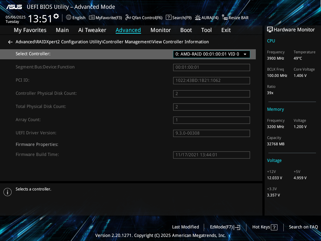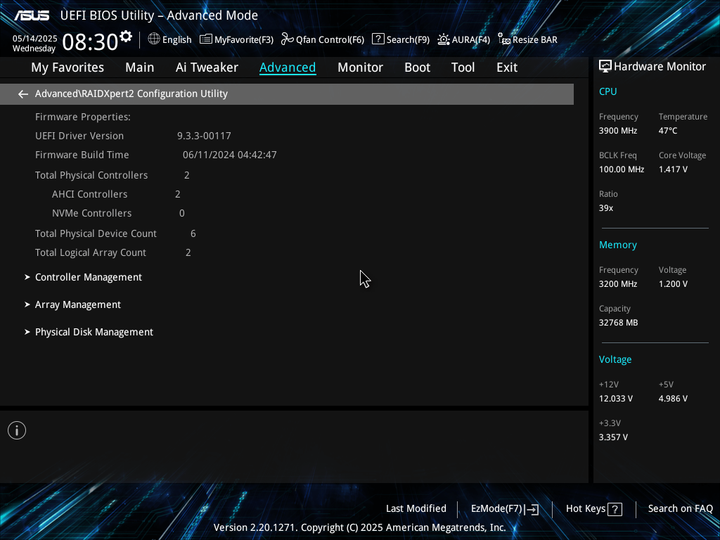 Уведомление о рассыпавшемся RAID - только на экране (срабатывает с задержкой в единицы секунд). Другие варианты уведомления - костылями (постоянно смотреть постоянно на экран - зачастую неудобно и непрактично): rcadm.exe --follow --delay 6 --program "calc.exe" где "calc.exe" - система уведомлений (например e-mail, telegram и т.д.). RAIDXpert2 9.3.3.218 x64 (самая свежая версия, ~19.03.2025, ЦП отсутствует). Неплохой вариант, но отсутствует rcadm.exe Подробнее RAIDXpert2 9.3.3.97 x64 (на сайте amd - самая свежая версия; ~22.03.2024, ЦП отсутствует) curl -O -e drivers.amd.com https://drivers.amd.com/drivers/amd_raid_software_6.10.09.200.zip ~229 МБ Найдено тут: https://www.amd.com/en/support/downloads/drivers.html/chipsets/am5/a620.html Дистрибутив из "5 матрёшек". В дистрибутиве "полный комплект": vc, драйверы 9.3.3.00117 x64, RAIDXpert2, часть мануалов и readme. На самом деле "портабельна" (относительно ) и по-минимуму занимает ~28 МБ Если накидать vc-шных запчастей, то работает в winpe. Присутствует rcadm.exe (v. 9.3.3.97, x64, ~09.10.2024, ЦП - 09.10.2024) RAIDXpert2 9.2.0.128 от 17.07.2019 curl -e drivers.amd.com https://drivers.amd.com/drivers/amd_raid_drivers_v9.2.0.127.zip -O ~266 МБ, несмотря на название - тут и RAIDXpert2. Инсталлятор попросит изменить (установить) драйвера до версии 9.2.0.127, установит в т.ч. http-сервер apache. RAIDXpert2 8.1.0.70 от 27.07.2017 / RAIDXpert2_BR - вроде бы совместимо с win7 (и win 10) Есть Уведомление по email (проверить работоспособность: аутентификацию и т.п.), но куча всего в т.ч. апач раздражает. Тут упоминается много версий RAIDXpert2, а также старее 8.2 (эти не перебирал). Бонус: SMART Hard Disk Sentinel смог отобразить SMART каждого физического диска (но не умеет следить за статусом массивов amd-raid). CrystalDiskInfo смог отобразить SMART каждого физического диска (но не умеет следить за статусом массивов amd-raid). Часть 3. Motherboard Firmware - DXE Raid. Драйвер raid работающий в uefi ("bios-setup", uefi-shell, uefi-ventoy и т.п.). Просто из любопытства. Предисловие. Выше выяснилось что драйвер 9.3.3.00117 для windows (~ июнь..август 2024) умеет позволяет создавать raid5. Предположил что с dxe аналогичная ситуация. Проверяю. В свежей фирменной прошивке материнской платы (от 14.01.2025) содержится старый DXE-драйвер версии 9.3.0-00308 от 17-11-2021 (без raid5). Короче: пробую модифицировать прошивку матери чтобы добавить возможность создания raid5 в "bios setup". Примечание: насущная потребность неочевидна. 1. На материнской плате со старой прошивкой: . в WinPE (например server 2025) при загрузке свежего драйвера возможно создание RAID5 с помощью GUI (raidXpert2) или CLI (rcadm.exe). . можно пользоваться предварительно созданным raid5 (например для загрузки ос с raid5). 2. Прошивка модифицированным bios зачастую невозможна (без шаманства). Итак, к делу: Утилита "ubu" (UEFI BIOS Updater UBU_v1_80_b1 ) смогла обновить в файле прошивки DXE-драйвер как раз до 9.3.3.00117. Запись прошивки в материнку осуществлена фирменным асусовским способом "asus FlashBack" (в т.ч. "неподписанным файлом прошивки") с флешки (подходит для подопытной материнки). Извините, но без подробностей. Подводим итог. Было: 9.3.0-308 (17-11-2021) ; raid 0/1/10 (извините, скрин - бестолковый . Просто поверьте на слово.) Стало: 9.3.3-117(11-06-2024) ; raid 0/1/10/5 (появился вариант RAID5) Итого. Обновил dxe до 9.3.3-00117 - в "bios setup" появилось "создание raid5". Предположение подтвердилось. 2do: uefi shell ~ https://github.com/pbatard/UEFI-Shell/releases ; shellx64.efi - для сабжа (например это) rcadm.efi https://download.lenovo.com/km/media/attachment/rcadm.efi (9.3.0-00167, ~25.03.2020) Версию можно увидеть там: rcadm.efi -M -qa При стирании с дисков (которые были raid) и последующем заходе в "bios setup" - никакого конфига raid не видно. Ощущение что в "cmos" (в материнке) настройки raid не хранятся. Интересно, можно ли создать бекап конфига raid (у amd-raid ) как-то "по-человечески" ? Н