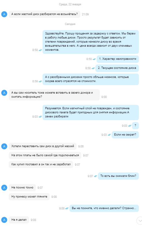 Silver Member | Редактировать | Профиль | Сообщение | Цитировать | Сообщить модератору Vfiuchcikicshuusrch раз пищит, значит какая-то голова/поверхногсть в хлам. Снимаешь головы под микроскоп. плохую удаляешь. Покупаешь дононоры, комплекс. Вычитаешь по живым или сразу донора ставишь. Сам он с чужими головами не заработает. Нужно микропрограмму обманывать. Вычитывать в DE. Обходя царапины. У опытного мастера, минимум неделю займет процесс. имеющему все необходимое оборудование и огромный опыт. Сколько у вас и во что встанет, даже представить сложно. Только чуть разобраться, как диски устроены и работают, это минимум пару лет. Если данные реально нужны, к мастеру. Но будет очень дорого, раз сами полезли. Если не очень или денег нет, забудьте о них. |